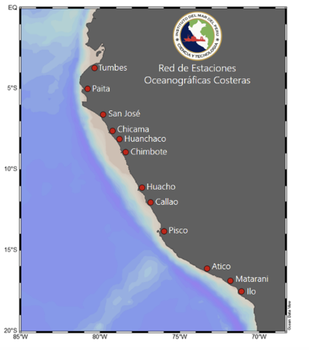 El IMARPE dispone de una red de estaciones oceanográficas en el litoral peruano ubicadas en Tumbes, Paita, San José, Chicama, Huanchaco, Chimbote, Huacho, Callao, Pisco, Atico, Matarani e Ilo.
