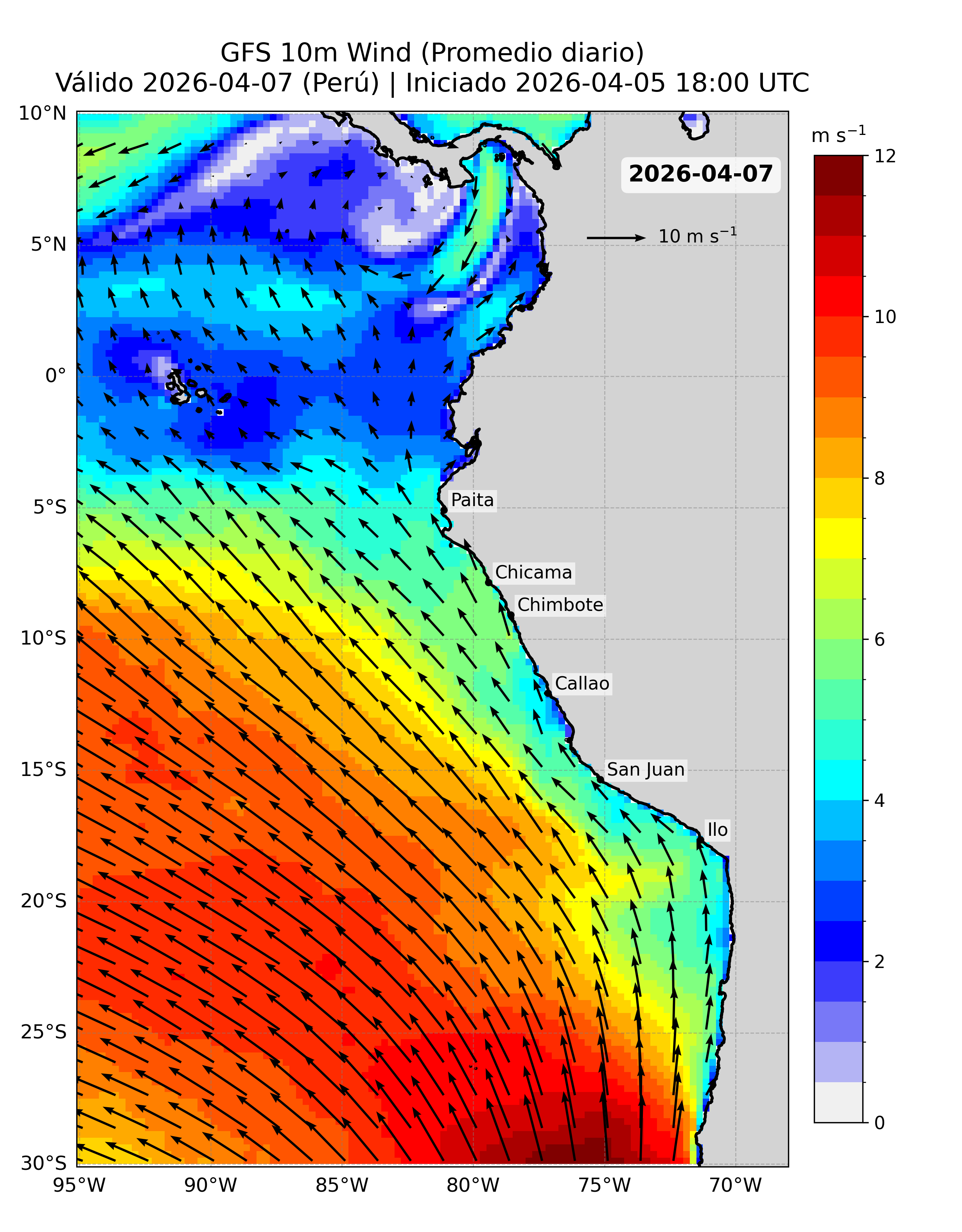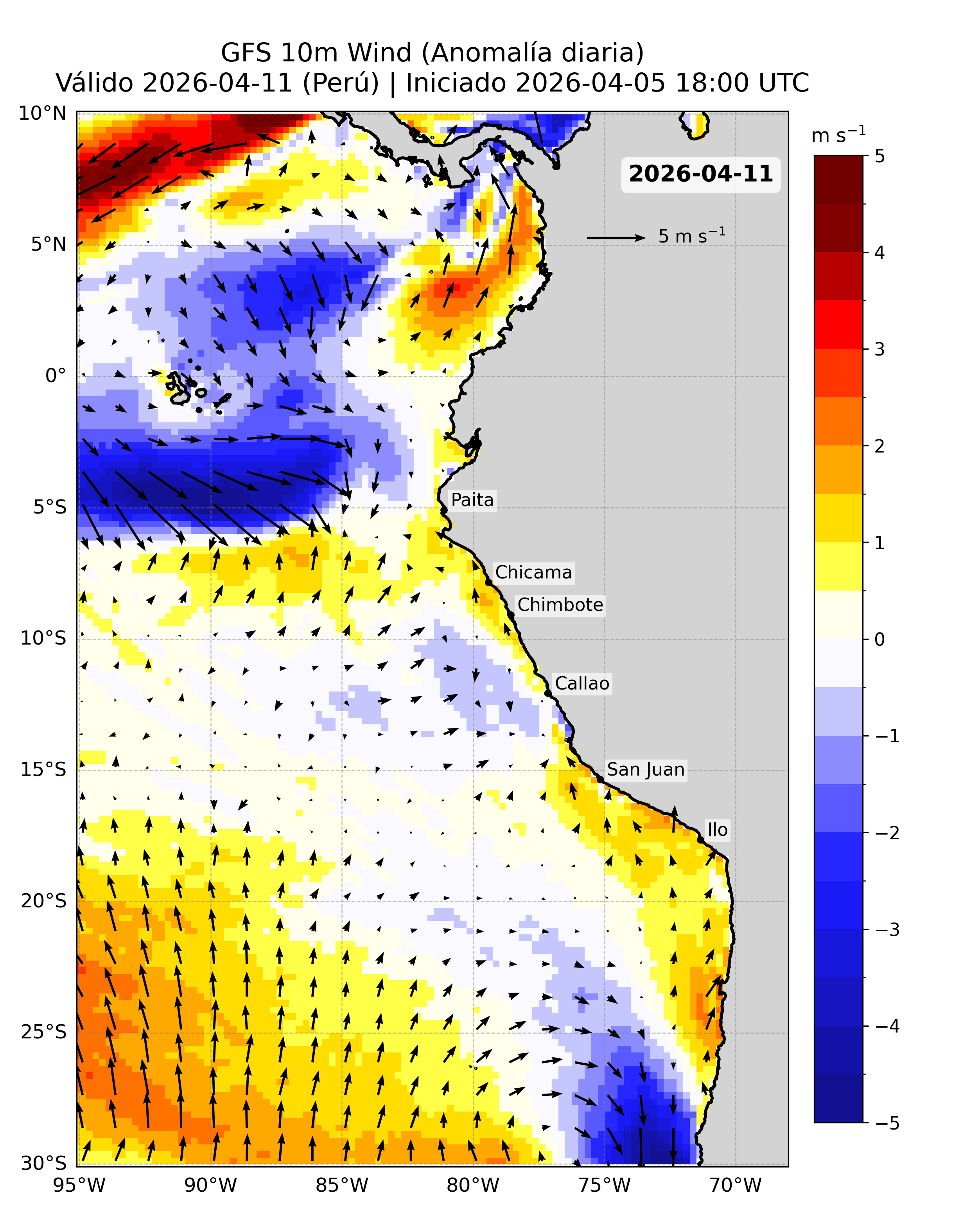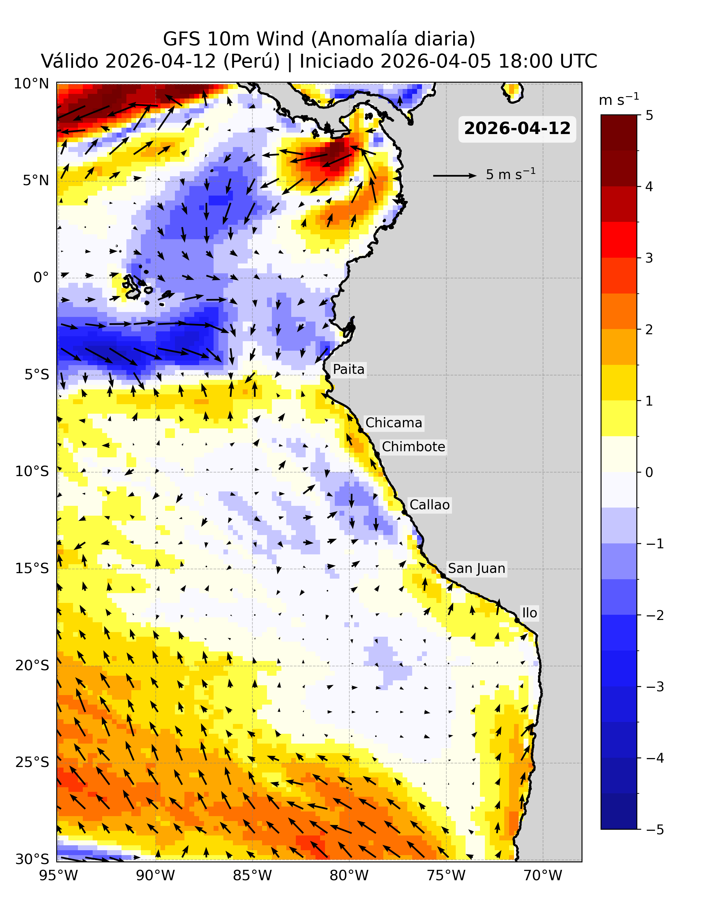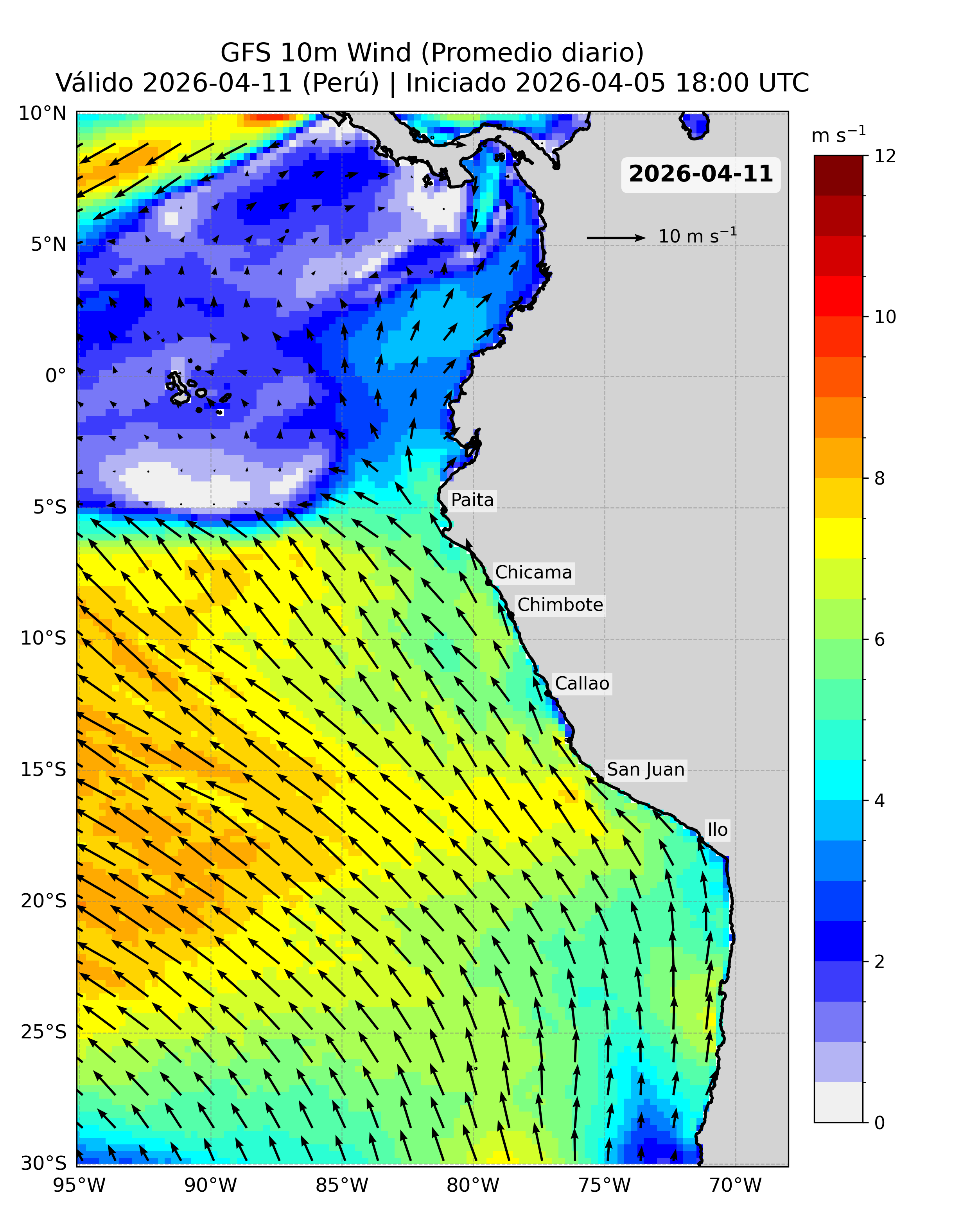 A continuación se presentan los productos de pronóstico basados en esta fuente de datos, incluyendo los mapas del pronóstico de la velocidad del viento (VV, m/s) frente a la costa peruana y sus anomalías.