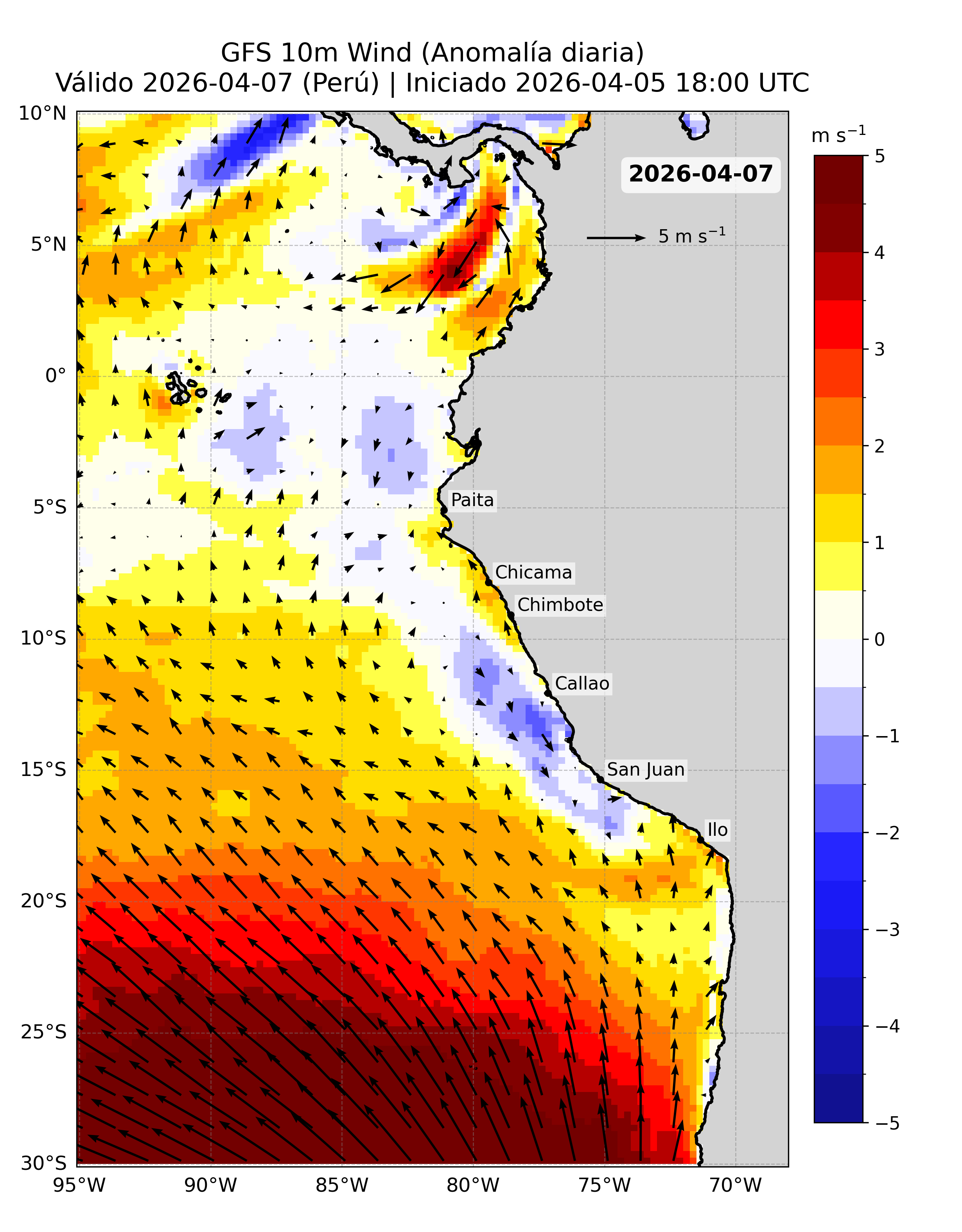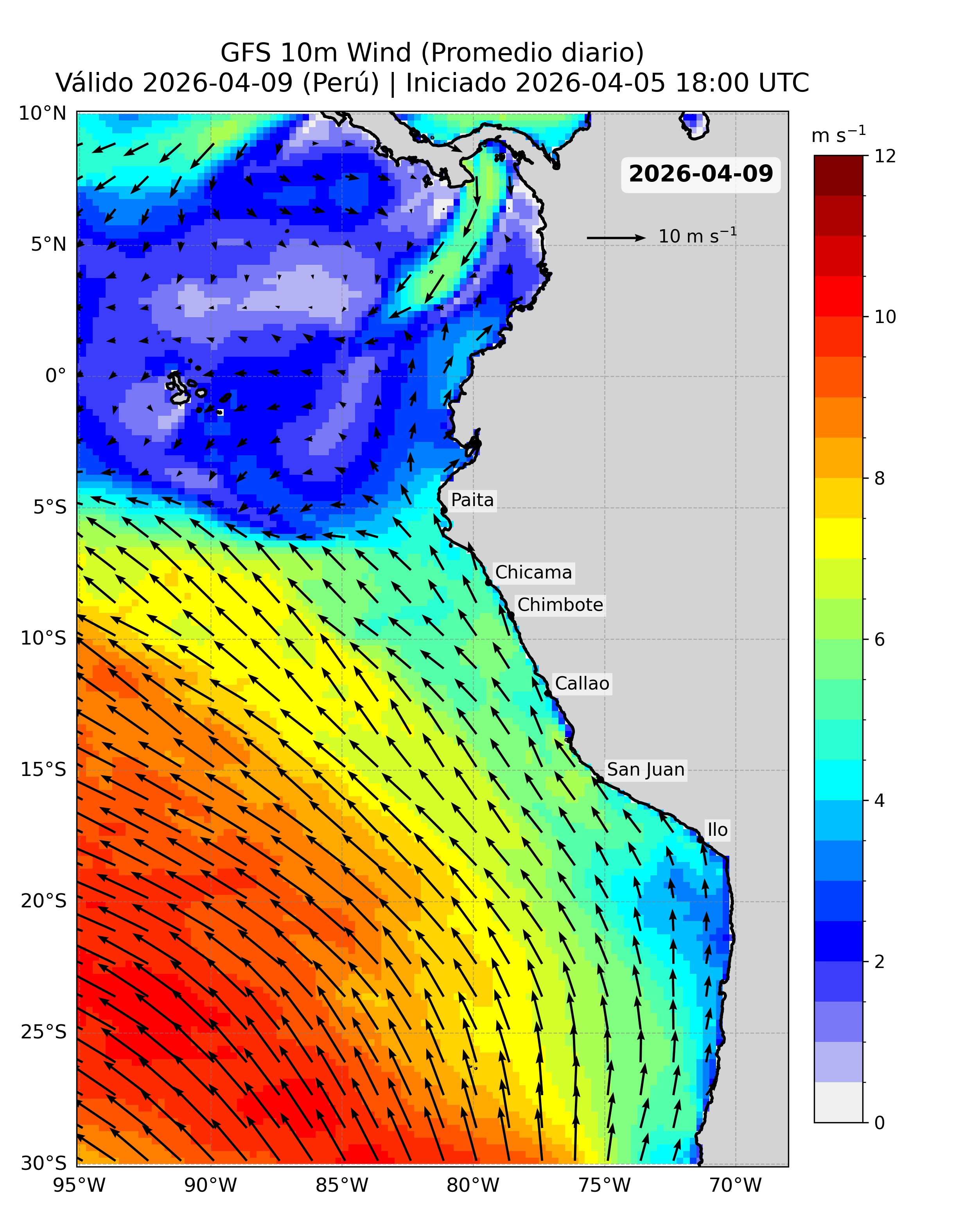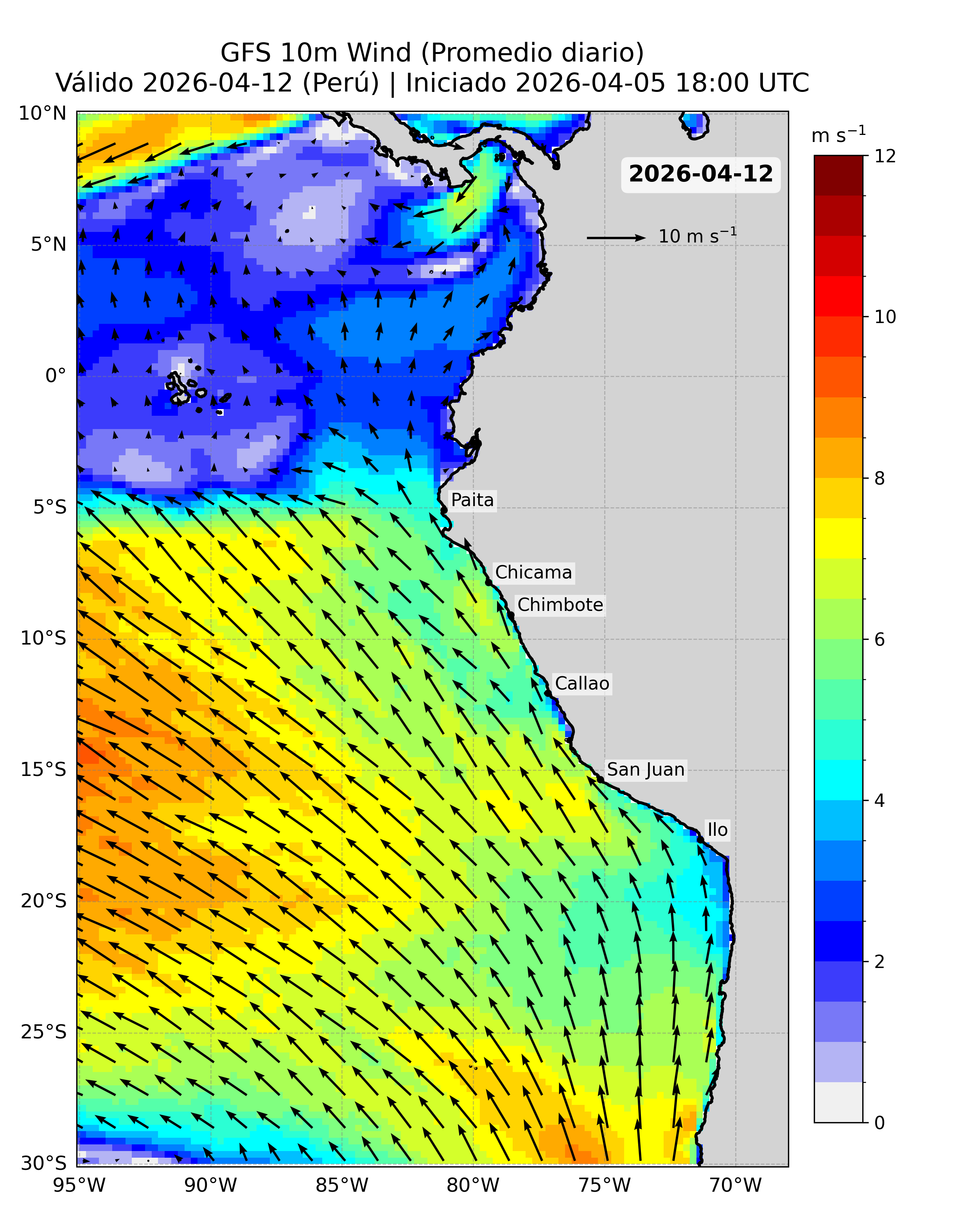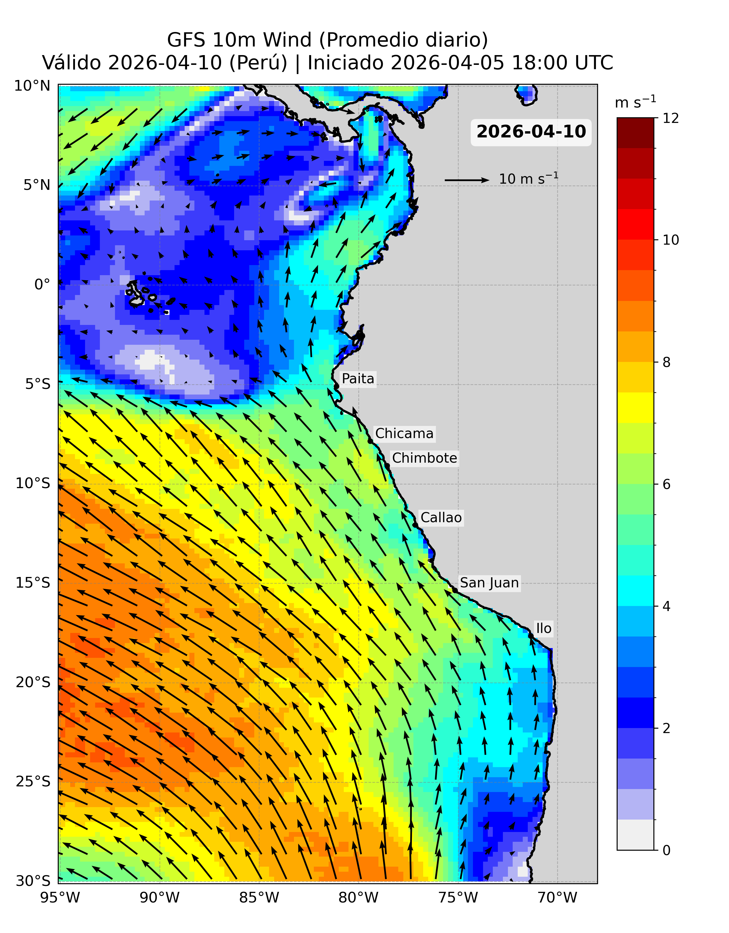 A continuación se presentan los productos de pronóstico basados en esta fuente de datos, incluyendo los mapas del pronóstico de la velocidad del viento (VV, m/s) frente a la costa peruana y sus anomalías.
