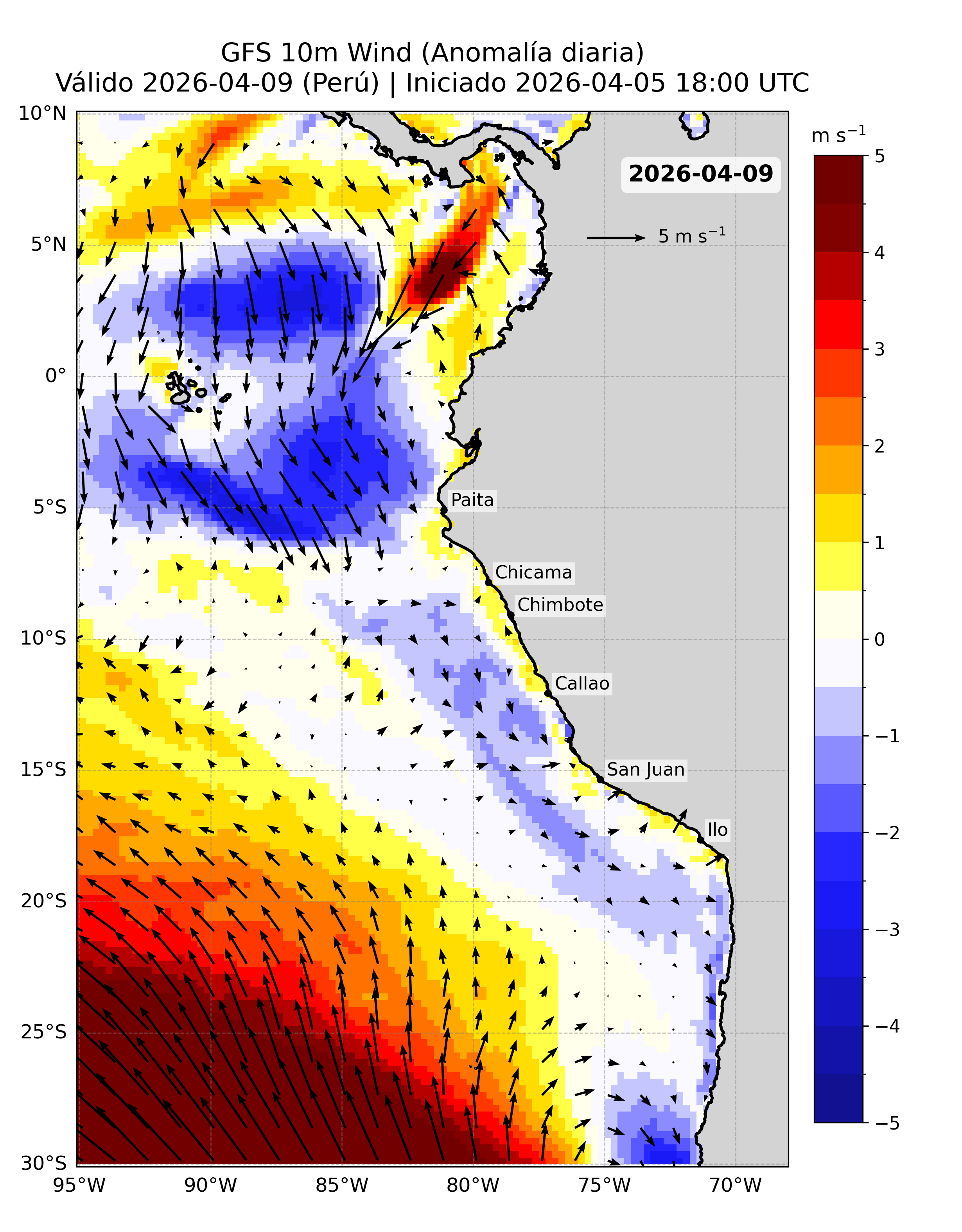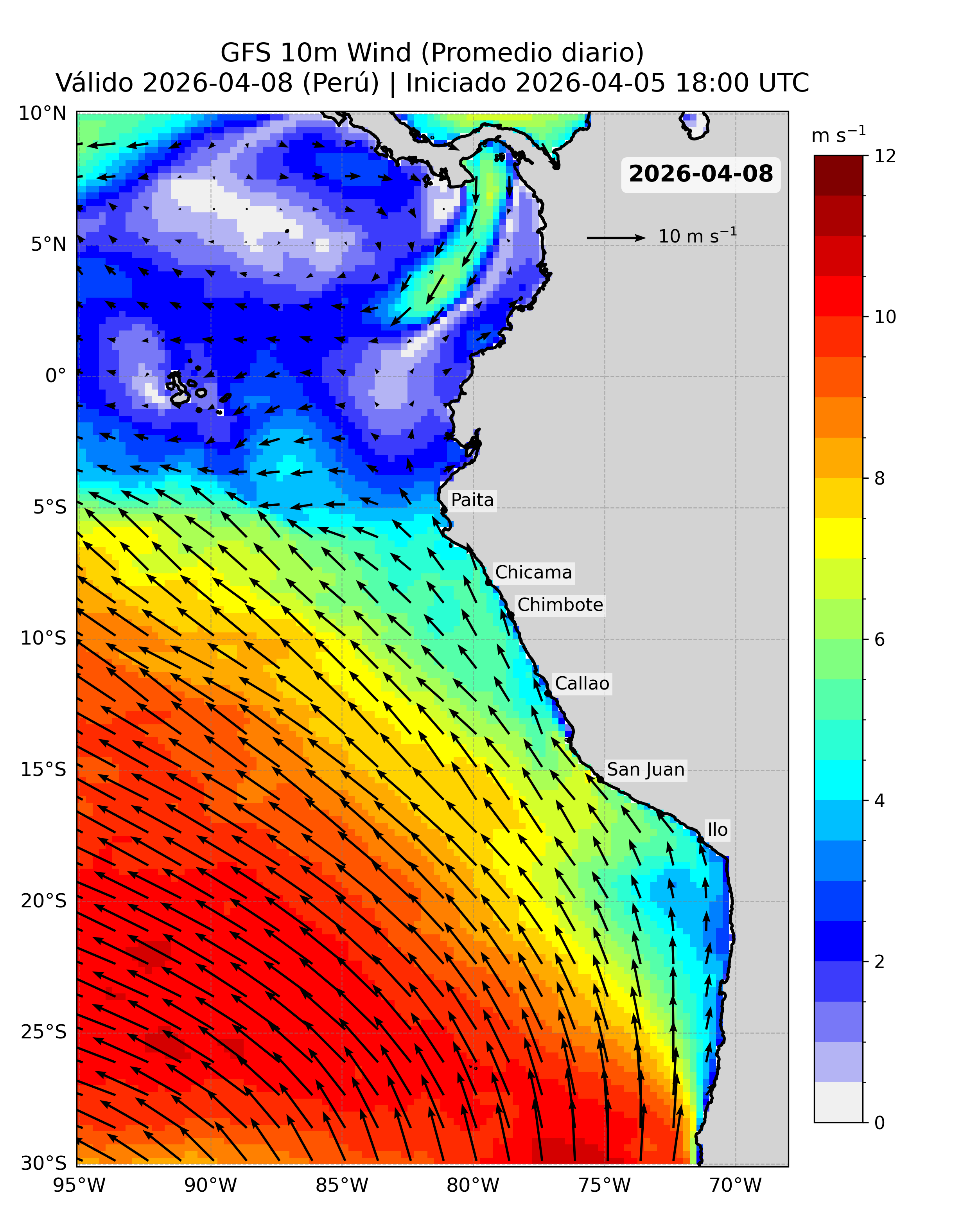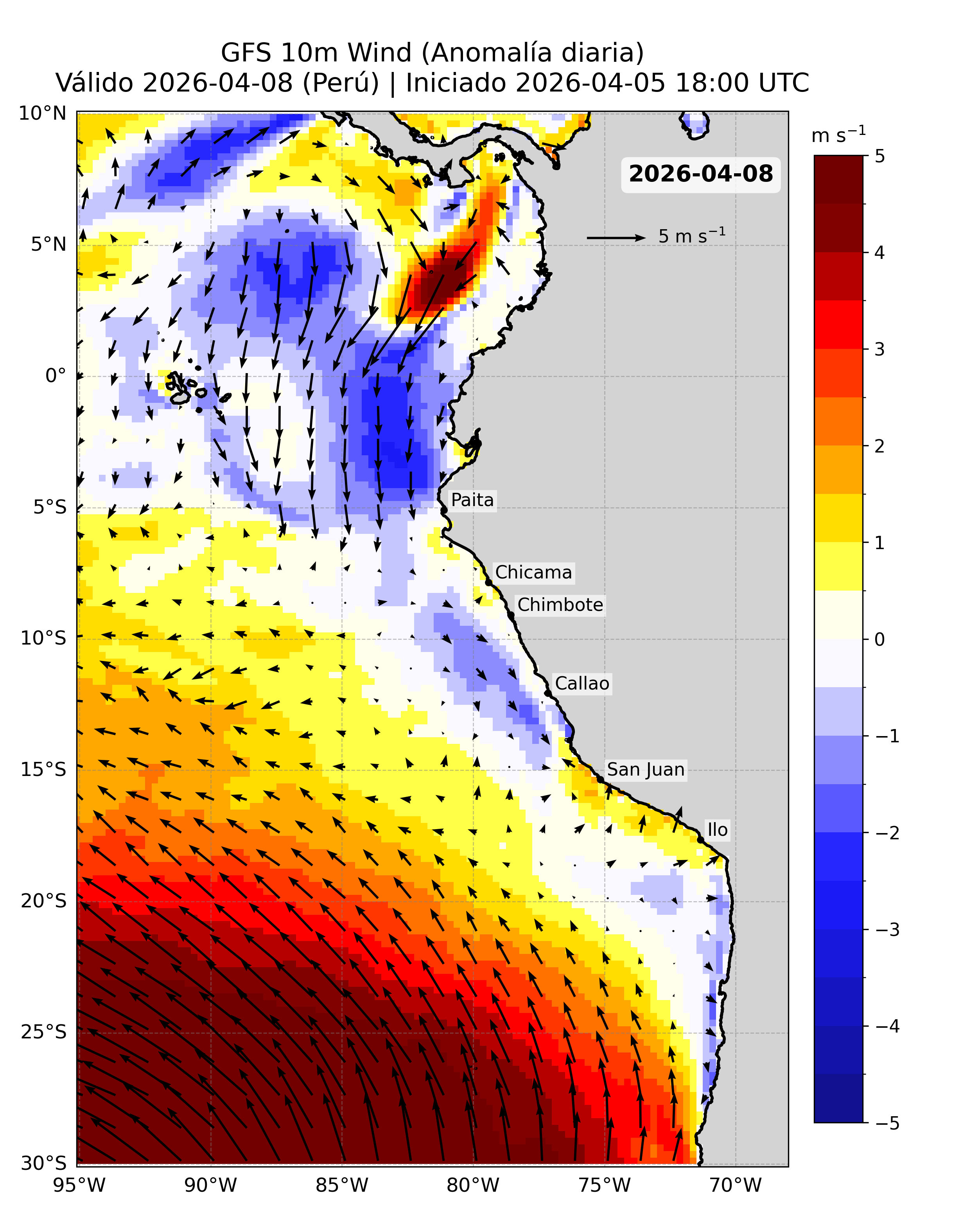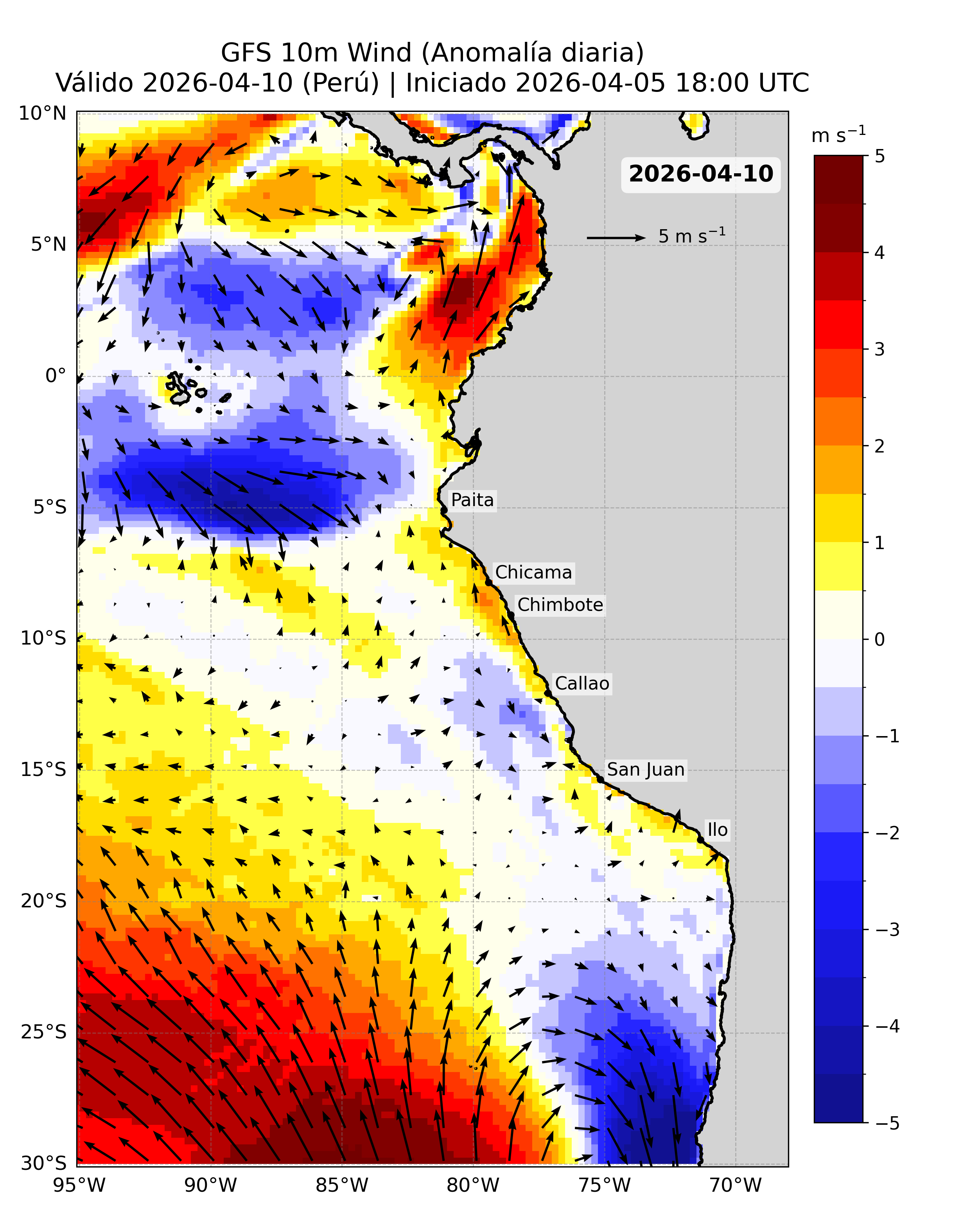 Para abordar esta necesidad, se emplean datos del Modelo Atmosférico del Sistema de Pronóstico Global (GFS), desarrollado por NOAA/NCEP, que proporciona proyecciones diarias de viento a nivel global con cobertura completa del océano. Este modelo ha sido seleccionado por su disponibilidad operativa, frecuencia de actualización y cobertura espacial, así como por su compatibilidad con series históricas observadas (e.g. QuikSCAT y ASCAT), lo que permite estimar anomalías y construir una climatología confiable. La información se obtiene a través del sistema ERDDAP de PacIOOS (https://pae-paha.pacioos.hawaii.edu/erddap/griddap/ncep_global.html).
