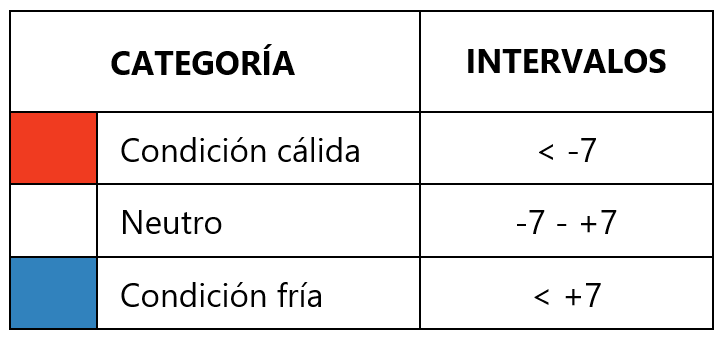 El índice de Oscilación sur (IOS, http://www.bom.gov.au/climate/enso/#tabs=Pacific-Ocean&pacific=SOI) mide la fluctuación, a gran escala, de la diferencia de la presión atmosférica entre Darwin (Pacífico tropical occidental) y Tahití (Pacífico tropical oriental-central) (Yan, et al., 2011). El IOS es un indicador de los eventos El Niño y La Niña (Trenberth, 2019). Los valores positivos sostenidos del IOS por encima de +7 suelen indicar el evento La Niña, mientras que los valores negativos por debajo de -7, El Niño. Los valores entre +7 y -7 generalmente indican condiciones neutrales.