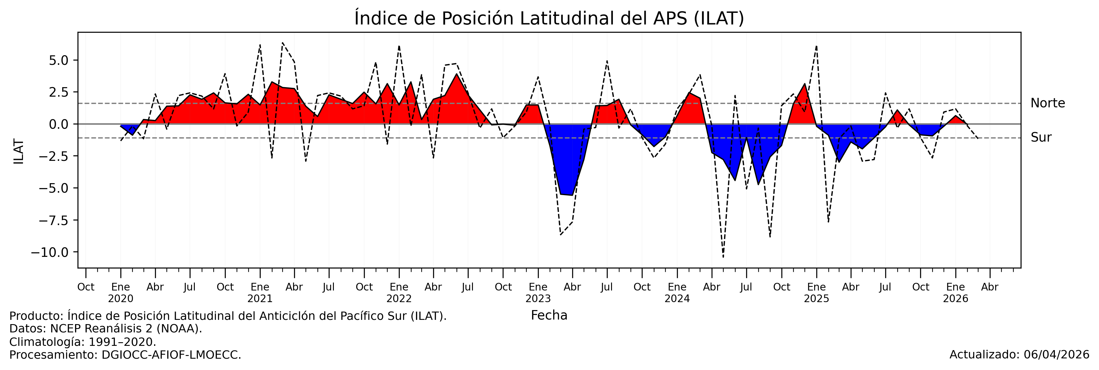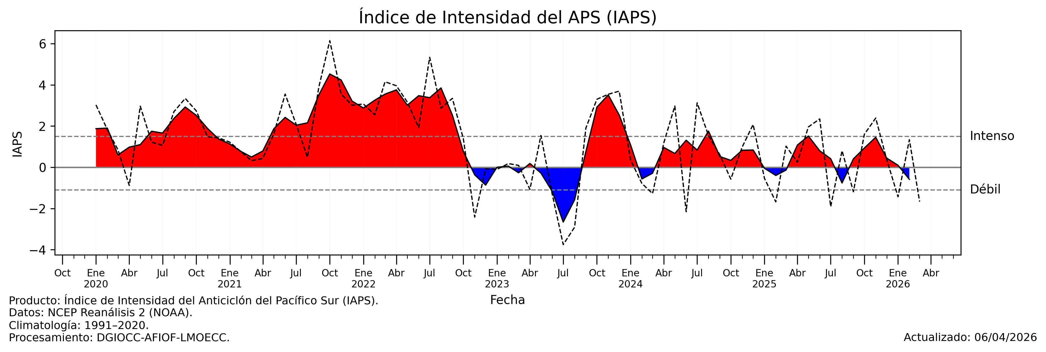El Anticiclón del Pacífico Sur (APS) tiene un rol fundamental en la variabilidad climática regional como impulsor de los vientos alisios del Pacífico sudeste. Por este motivo, en el IMARPE se han desarrollado índices que permiten caracterizar la variabilidad de la intensidad y posición geográfica del APS (Chamorro Gómez, 2018; Quispe-Ccalluari et al, 2015).