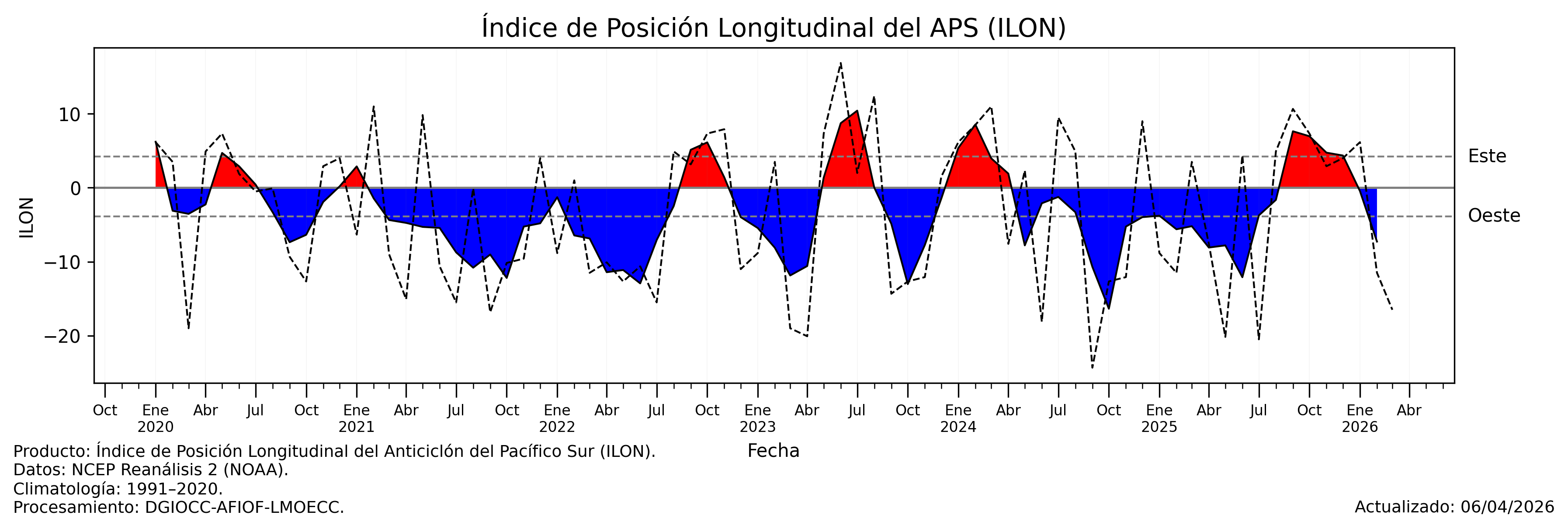 Los índices de intensidad (IAPS) y posición (ILON, ILAT) del APS, se calculan a partir de las anomalías máxima de la presión atmosférica a nivel del mar en la región del Pacífico oriental subtropical y su correspondiente posición longitudinal y latitudinal. Las anomalías se obtienen usando el periodo base 1981-2010. Los índices se determinan aplicando el promedio móvil de tres meses a las series mensuales de intensidad y posición. Las anomalías se calculan usando el periodo base 1991-2020. Los datos de la presión atmosférica provienen del reanálisis del NCEP/NOAA (Kalnay et al, 1996) disponibles desde enero 1948 hasta el presente en https://psl.noaa.gov/data/reanalysis/reanalysis.shtml.