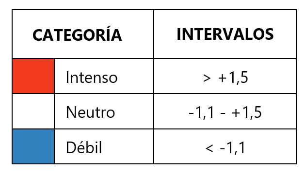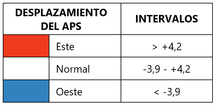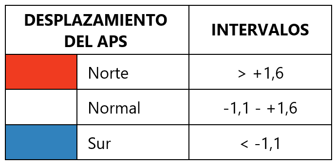 El IAPS se clasifica en 3 condiciones (débil, neutro e intenso) mediante 2 umbrales definidos por los percentiles 20 y 80 de la serie del IAPS. Para los índices sobre la posición latitudinal (ILAT) y longitudinal (ILON) se usan los percentiles 25 y 75. Los valores positivos (negativos) de los índices ILON e ILAT sobre (debajo) del umbral indican un desplazamiento al este y al norte (al oeste y al sur) del APS con respecto a su posición climatológica.