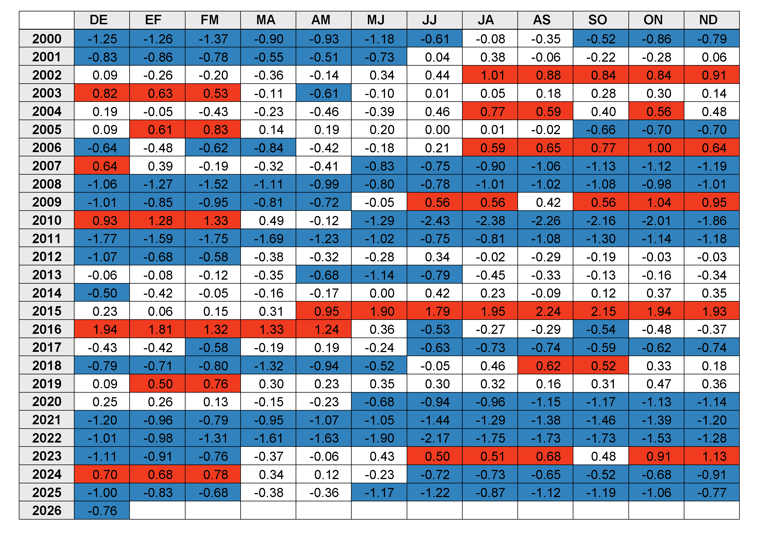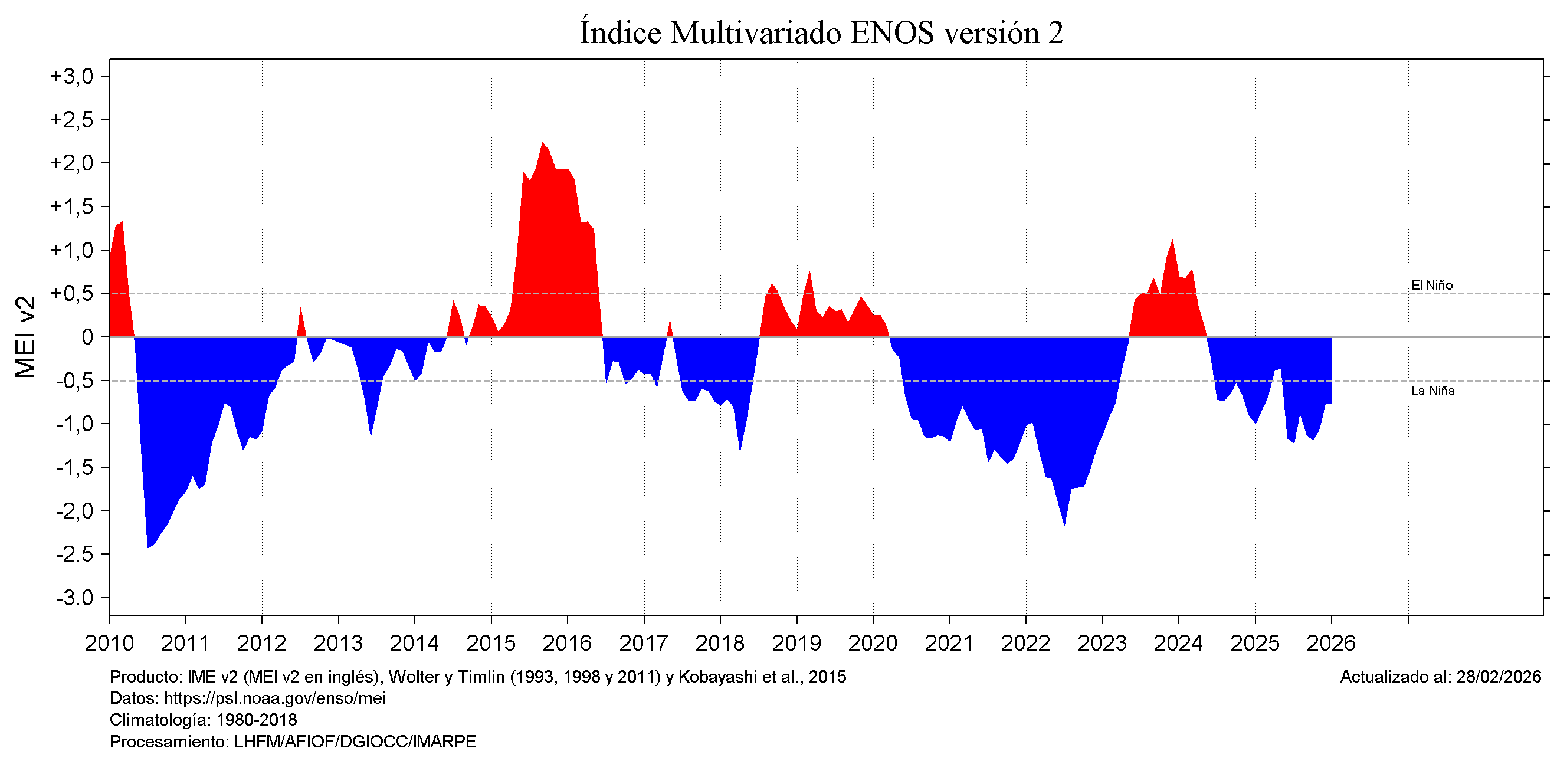 El índice bimestral multivariado de El Niño/Oscilación del Sur (ENSO) (MEI v2; https://psl.noaa.gov/enso/mei/) es la serie de tiempo de la Función Ortogonal Empírica (EOF) que combina cinco variables diferentes ((presión al nivel del mar (SLP), temperatura de la superficie del mar (SST), componentes zonales y meridionales del viento a nivel superficial y la radiación de onda larga saliente (OLR)) sobre la cuenca del Pacífico tropical (30 °S-30 °N y 100 °E-70 °W). Las EOF se calculan para 12 "temporadas" bimestrales superpuestas (de diciembre-enero a noviembre-diciembre).