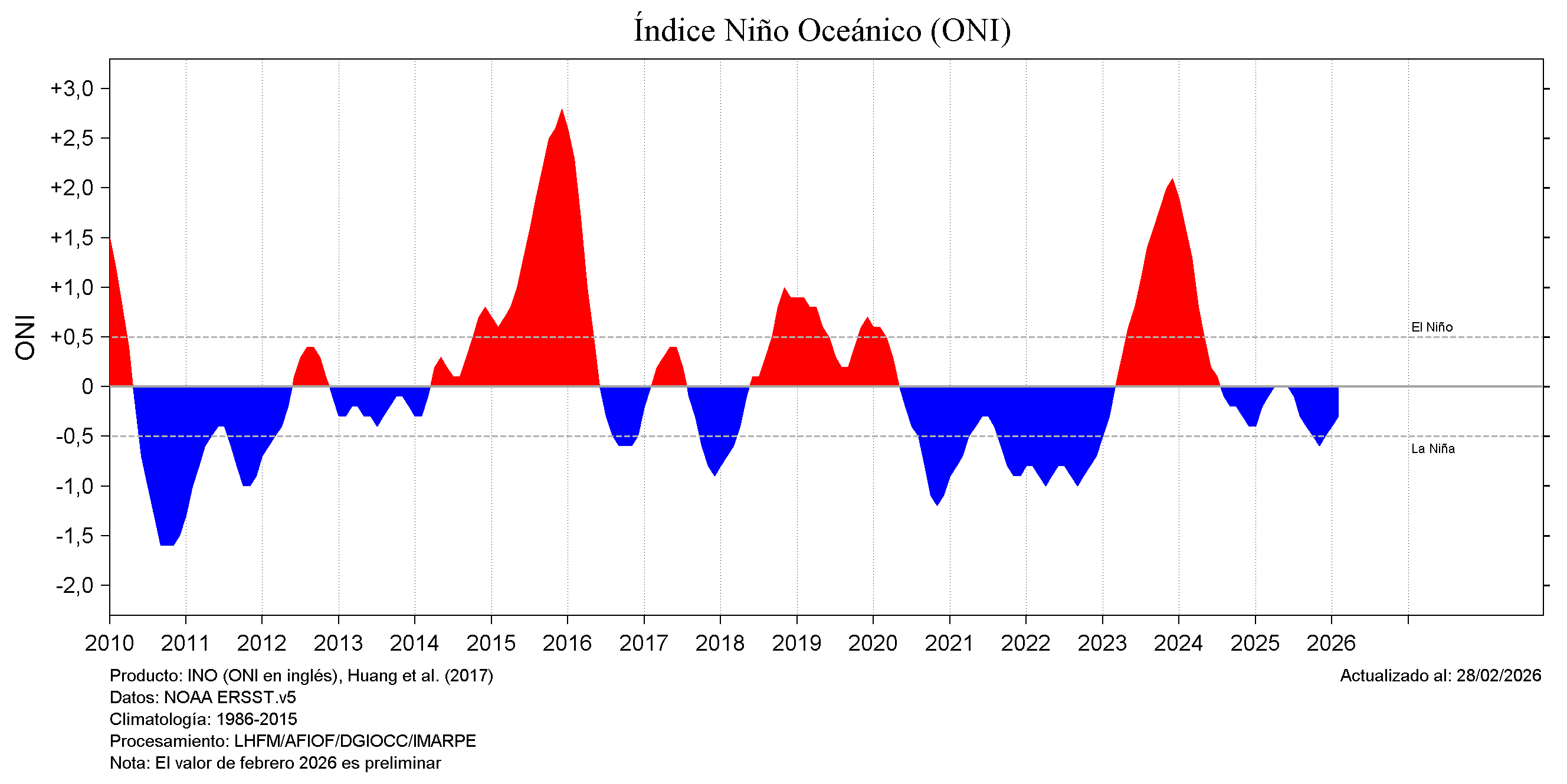El ONI es el promedio móvil de tres meses de las anomalías de la temperatura superficial del mar estimadas a partir del producto ERSST.v5 SST en la región Niño 3.4 (5°N-5°S, 120°-170°W), basado en periodos base de 30 años y que se actualizan cada 5 años. El umbral de la condición neutral es ± 0.5. Mayor información está disponible en https://origin.cpc.ncep.noaa.gov/products/analysis_monitoring/ensostuff/ONI_v5.php.