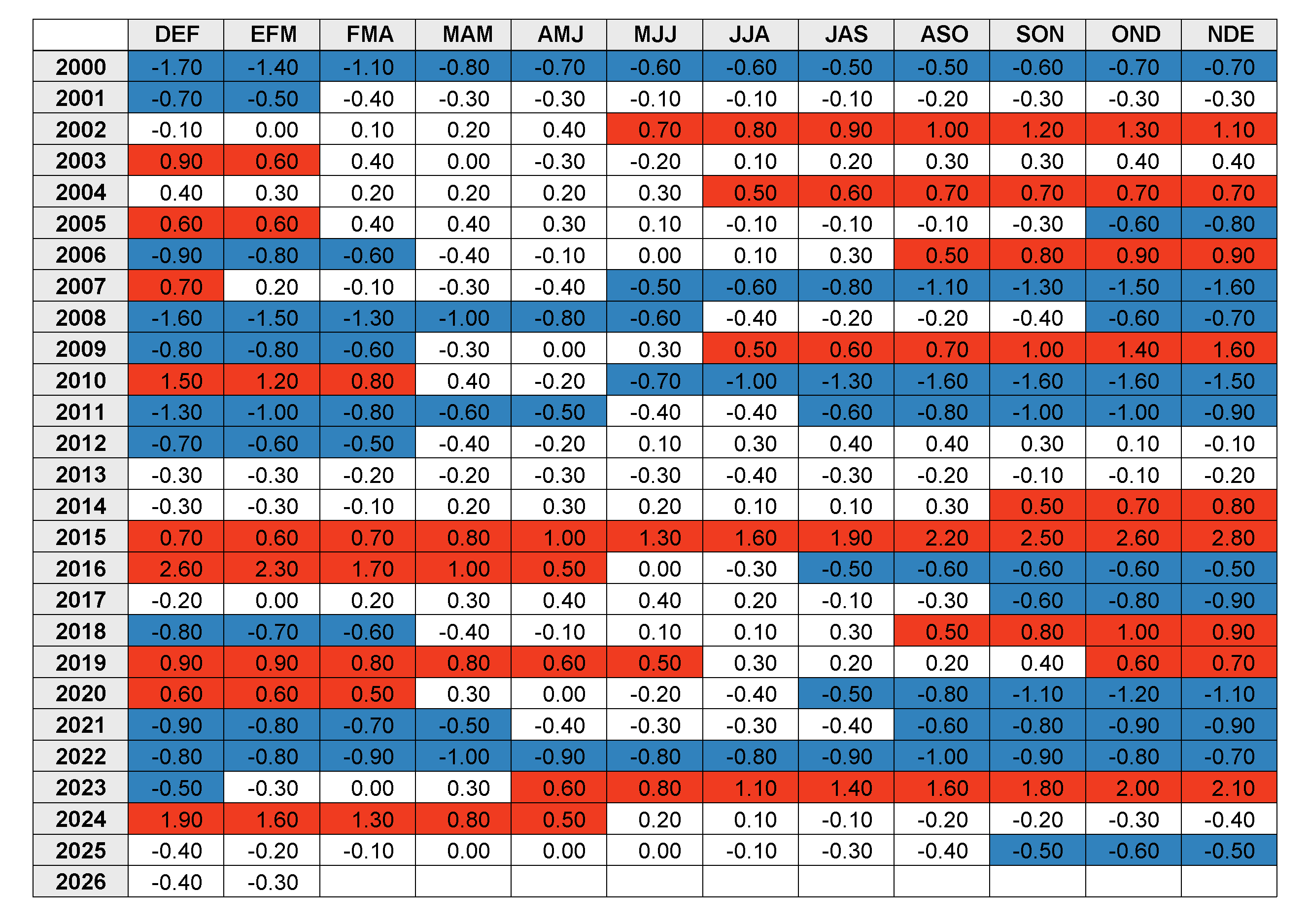 TABLA DE VALORES HISTÓRICOS DEL ONI