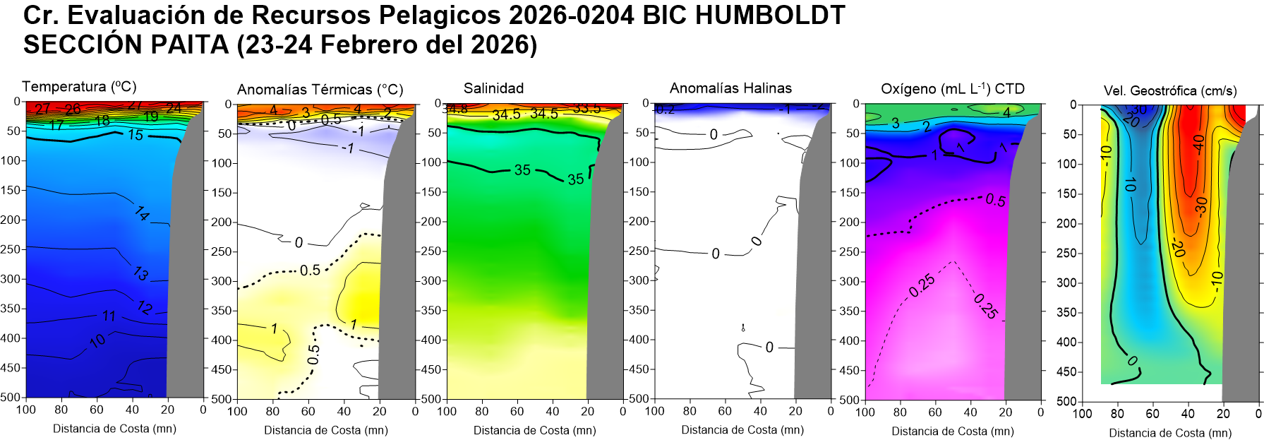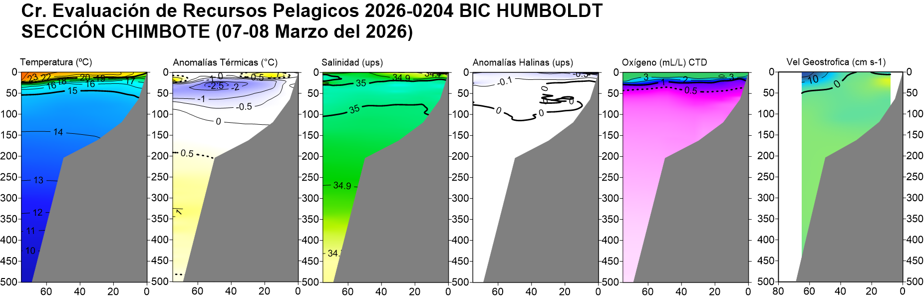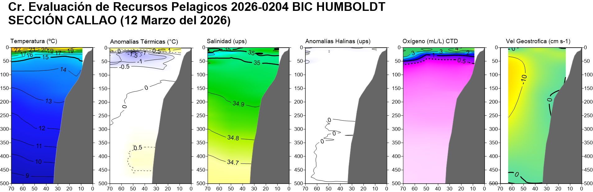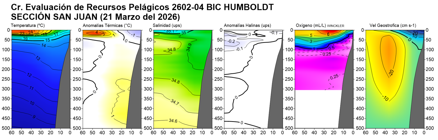 Estructura vertical de la: temperatura (°C), anomalías térmicas (°C), salinidad, anomalías halinas, oxígeno disuelto (ml/L) y velocidad geostrófica (cm/s); registradas en la sección oceanográfica frente Puerto Pizarro (19-20 de febrero), Paita (23-24 de febrero), Punta La Negra (26 de febrero), Chicama (02-03 de marzo), Chimbote (07-08 de marzo), Punta Bermejo (09-10 de marzo), Callao (12 de marzo), Pisco (18 de marzo), San Juan (21 de marzo), Atico (25 de marzo) e Ilo (30-31 de marzo); durante el Crucero de Evaluación Hidroacústica de la anchoveta, a bordo del BIC HUMBOLDT. Climatología: 1991-2020 (Domínguez et al (2023)). |