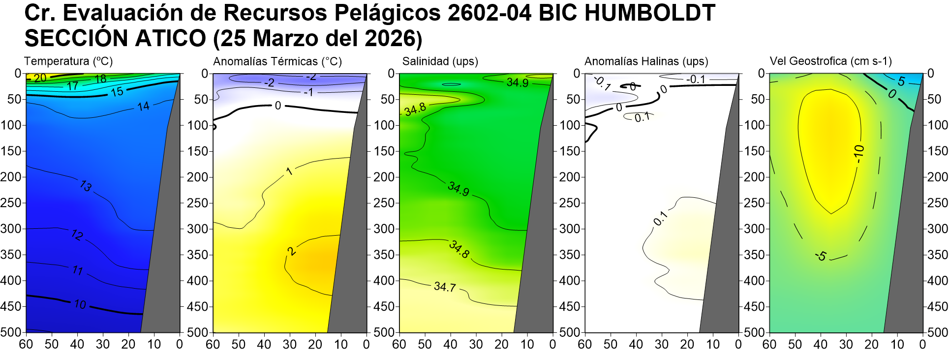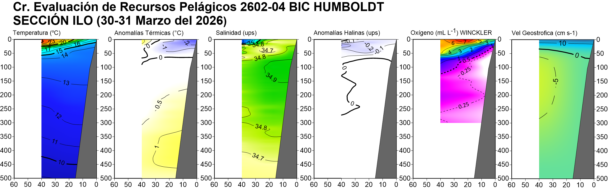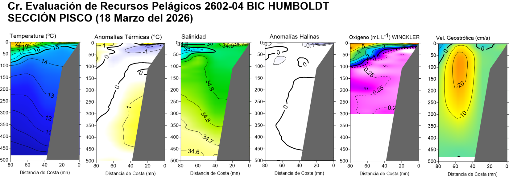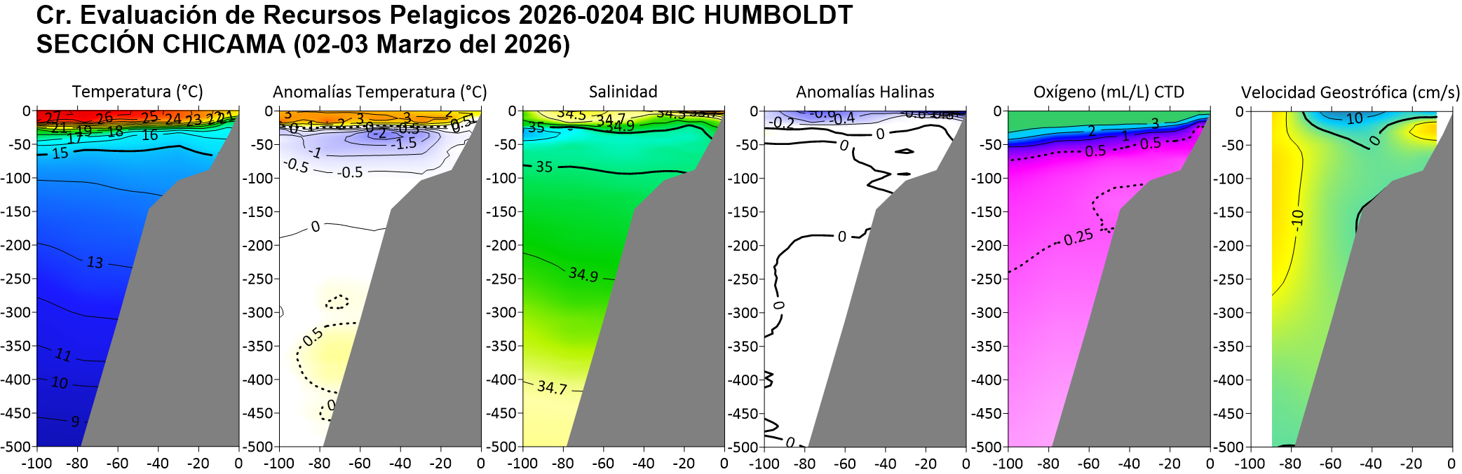 Estructura vertical de la: temperatura (°C), anomalías térmicas (°C), salinidad, anomalías halinas, oxígeno disuelto (ml/L) y velocidad geostrófica (cm/s); registradas en la sección oceanográfica frente Puerto Pizarro (19-20 de febrero), Paita (23-24 de febrero), Punta La Negra (26 de febrero), Chicama (02-03 de marzo), Chimbote (07-08 de marzo), Punta Bermejo (09-10 de marzo), Callao (12 de marzo), Pisco (18 de marzo), San Juan (21 de marzo), Atico (25 de marzo) e Ilo (30-31 de marzo); durante el Crucero de Evaluación Hidroacústica de la anchoveta, a bordo del BIC HUMBOLDT. Climatología: 1991-2020 (Domínguez et al (2023)). |