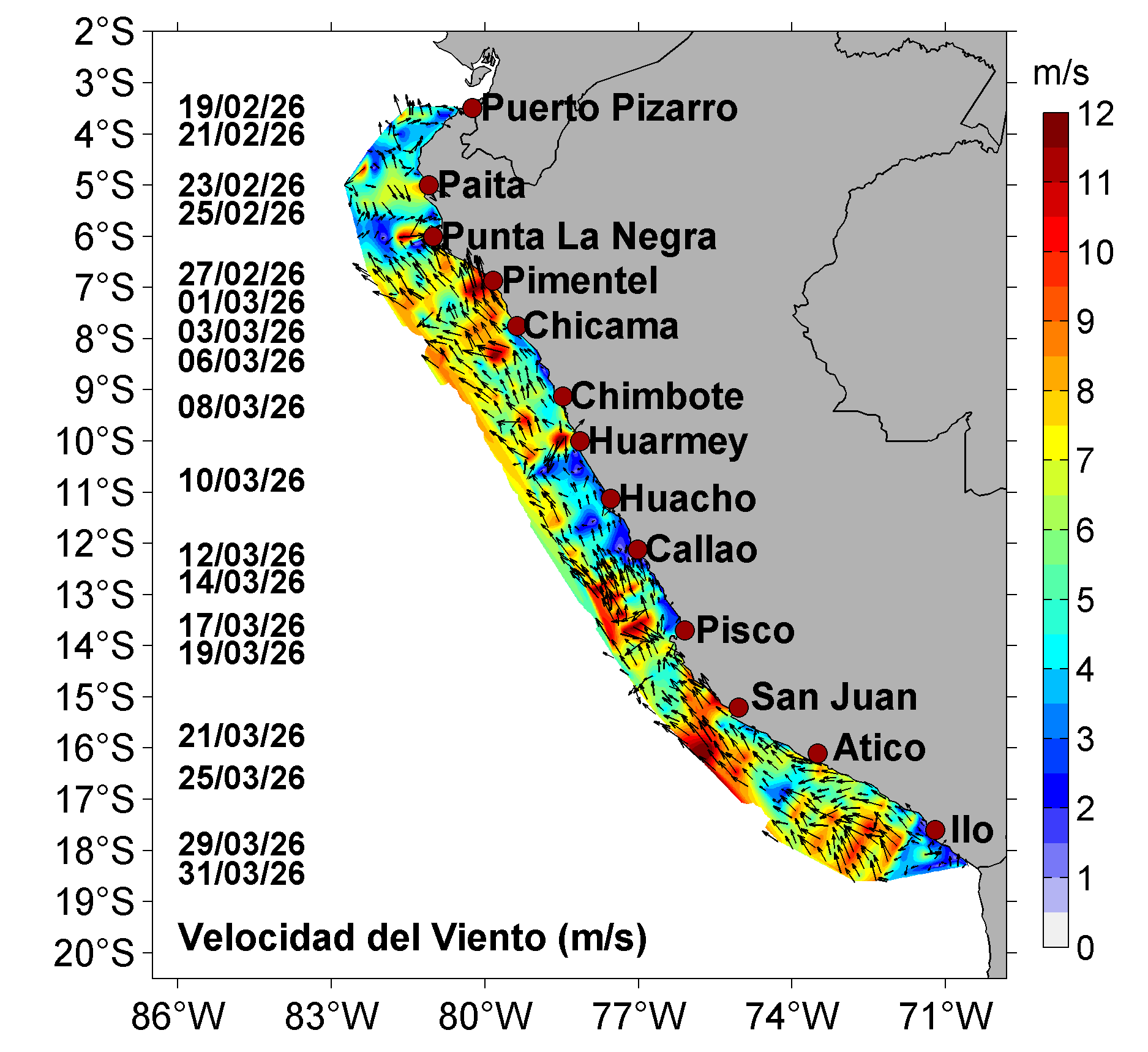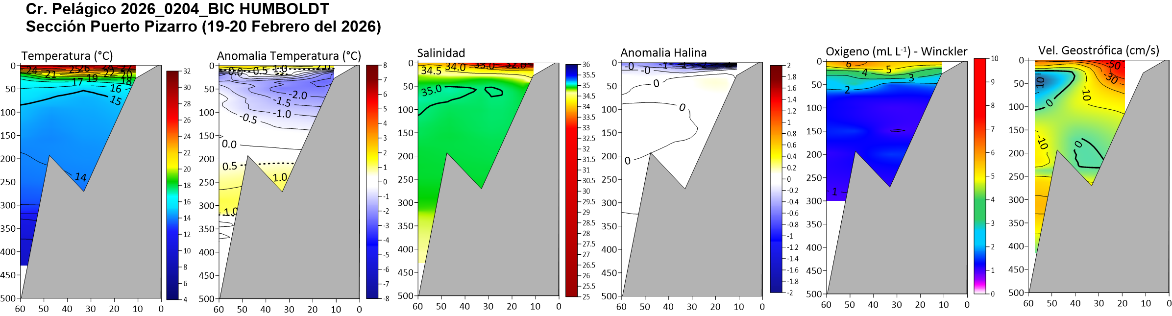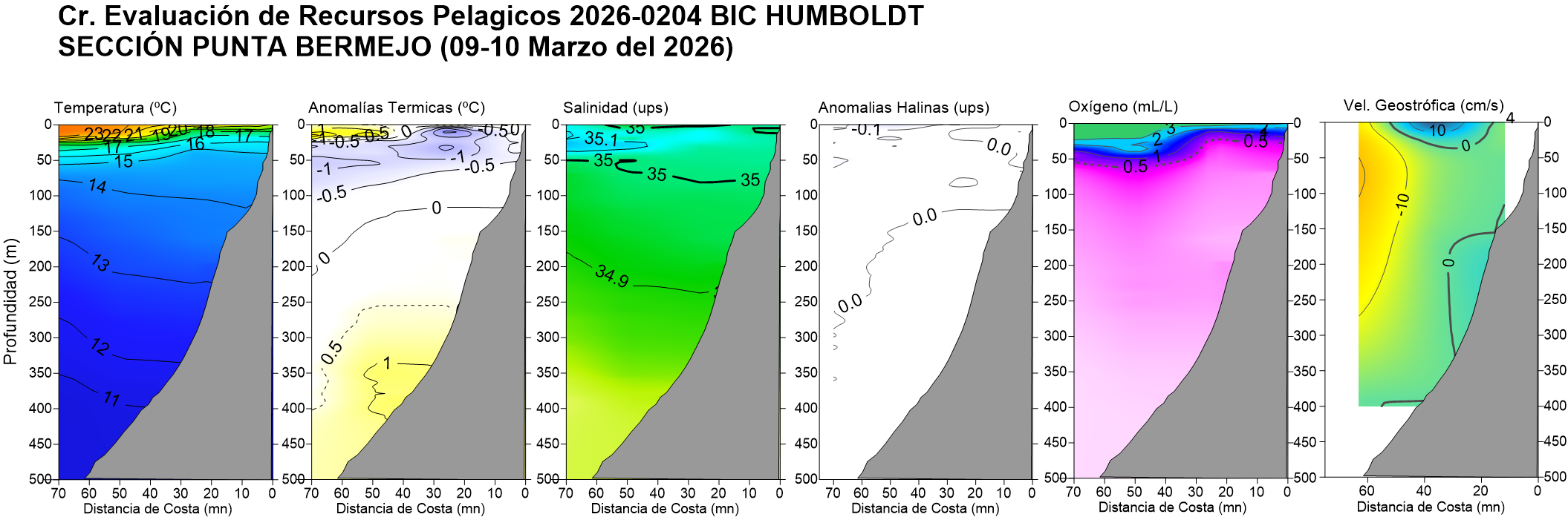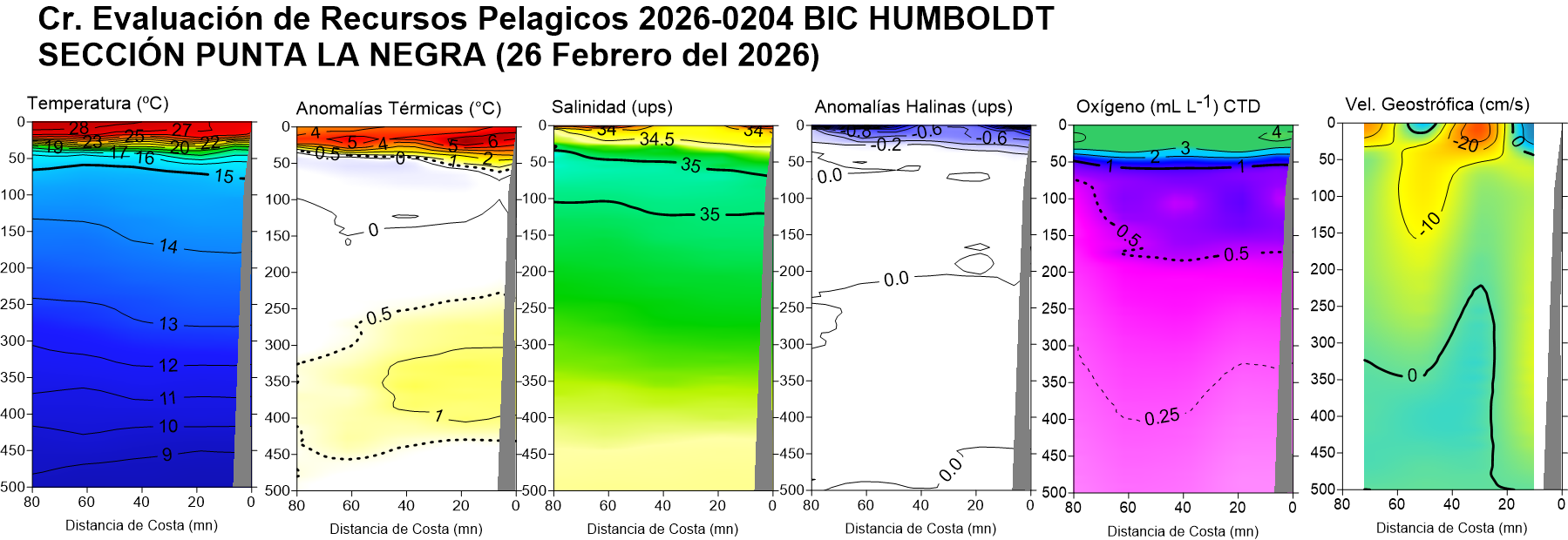 Estructura vertical de la: temperatura (°C), anomalías térmicas (°C), salinidad, anomalías halinas, oxígeno disuelto (ml/L) y velocidad geostrófica (cm/s); registradas en la sección oceanográfica frente Puerto Pizarro (19-20 de febrero), Paita (23-24 de febrero), Punta La Negra (26 de febrero), Chicama (02-03 de marzo), Chimbote (07-08 de marzo), Punta Bermejo (09-10 de marzo), Callao (12 de marzo), Pisco (18 de marzo), San Juan (21 de marzo), Atico (25 de marzo) e Ilo (30-31 de marzo); durante el Crucero de Evaluación Hidroacústica de la anchoveta, a bordo del BIC HUMBOLDT. Climatología: 1991-2020 (Domínguez et al (2023)). |