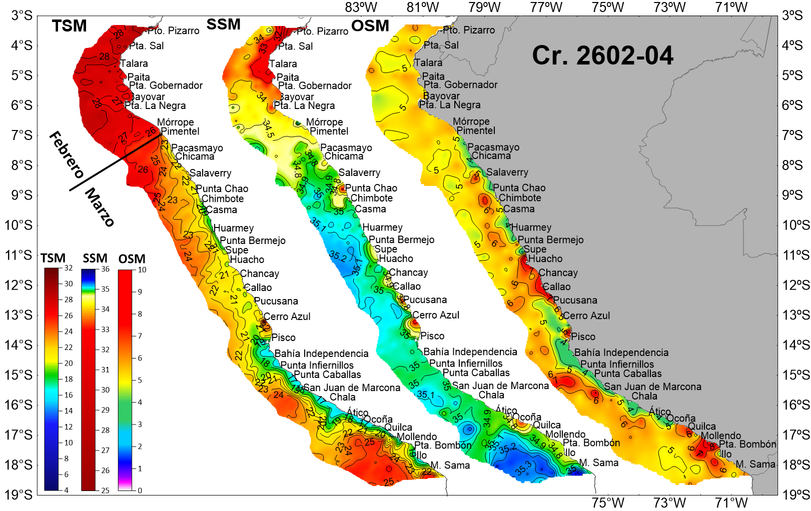 | Distribución superficial de la: temperatura (°C, TSM), salinidad (SSM), oxígeno (ml/L, OSM) y la velocidad del viento (m/s, VV); registradas entre Puerto Pizarro y Morro Sama durante el Crucero de Evaluación Hidroacústica de la anchoveta entre el 19 de febrero y 31 de marzo, a bordo del BIC Humboldt y BIC Flores. Climatología: 1991-2020 (Domínguez et al (2023)). | |