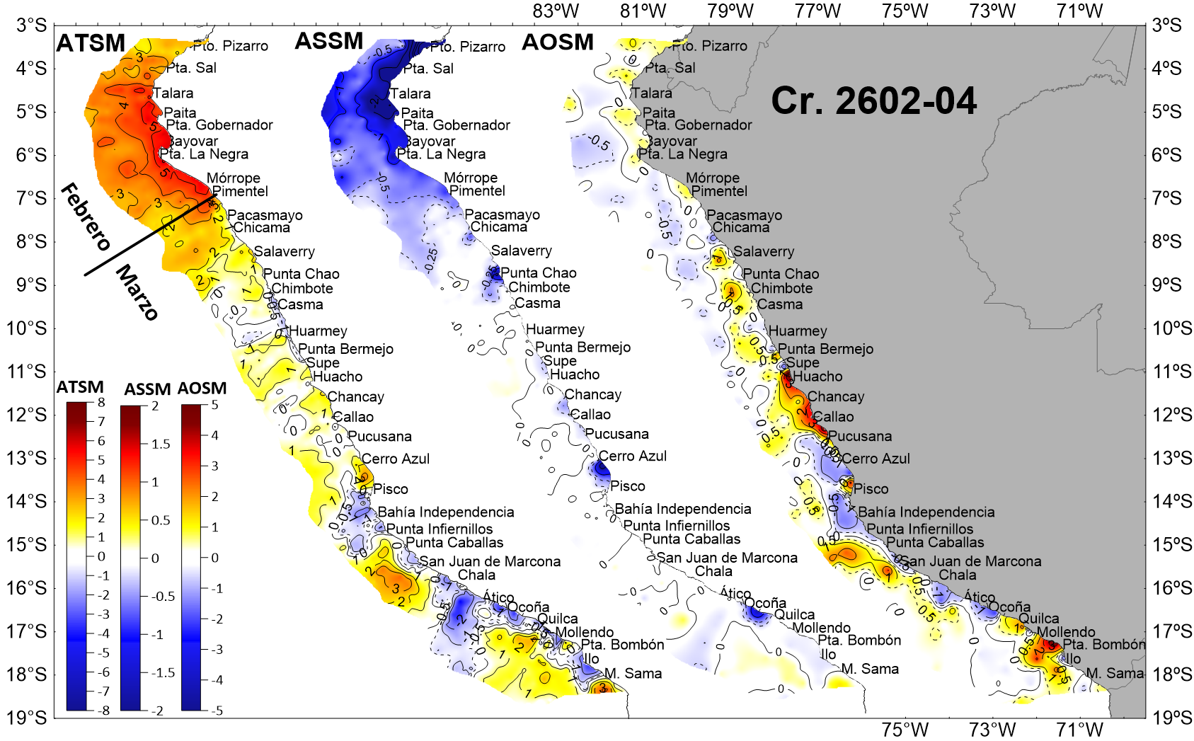 | Distribución superficial de las: anomalías térmicas (°C, ATSM), anomalías halinas (ASSM), anomalías de oxígeno (ml/L, AOSM) y la profundidad de la isoterma de 15 °C (m); registradas entre Puerto Pizarro y Morro Sama durante el Crucero de Evaluación Hidroacústica de la anchoveta entre el 19 de febrero y 31 de marzo, a bordo del BIC Humboldt y BIC Flores. Climatología: 1991-2020 (Domínguez et al (2023)). | |