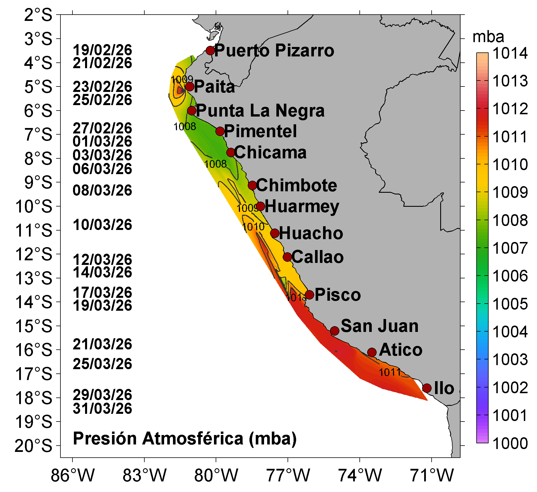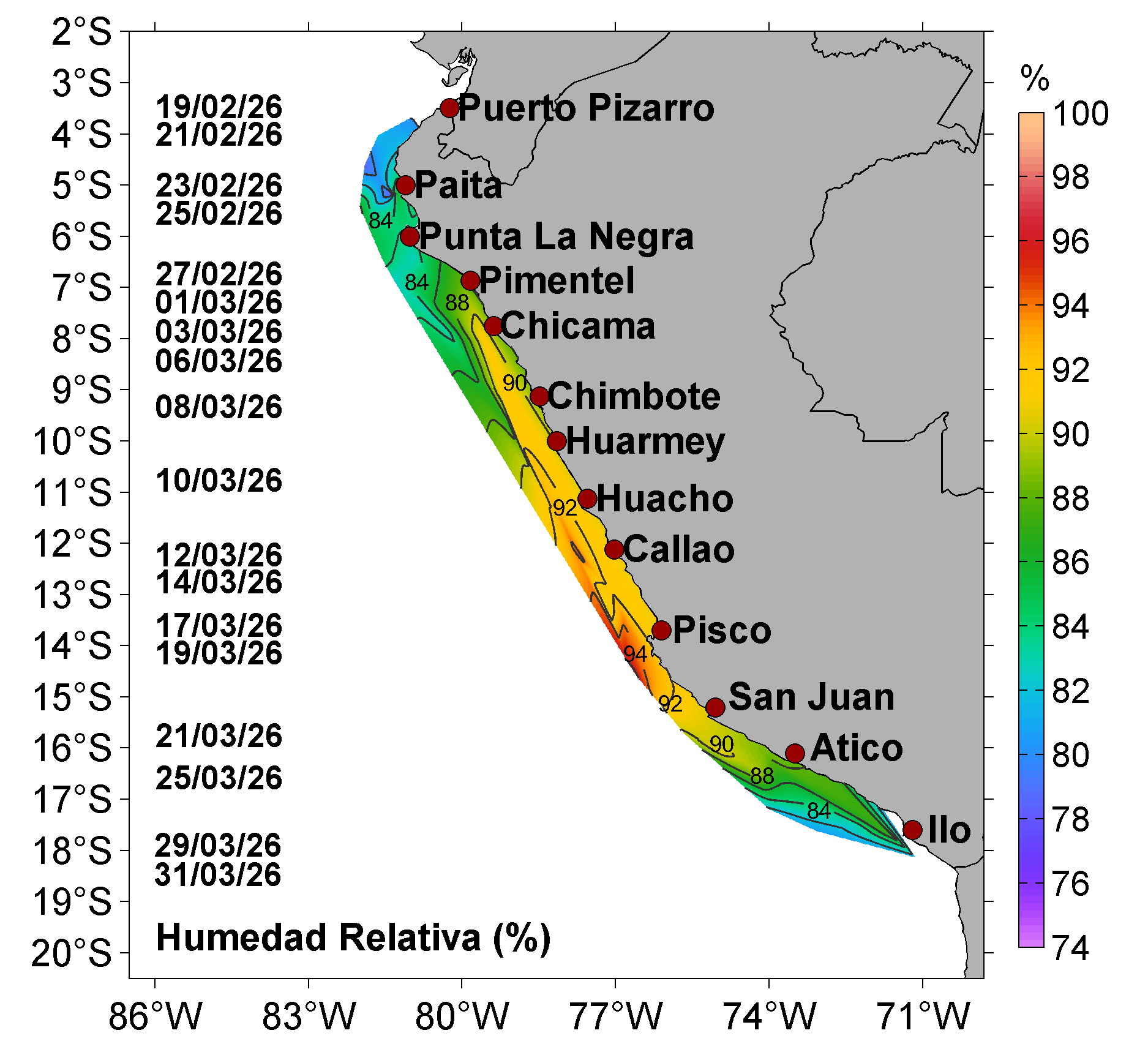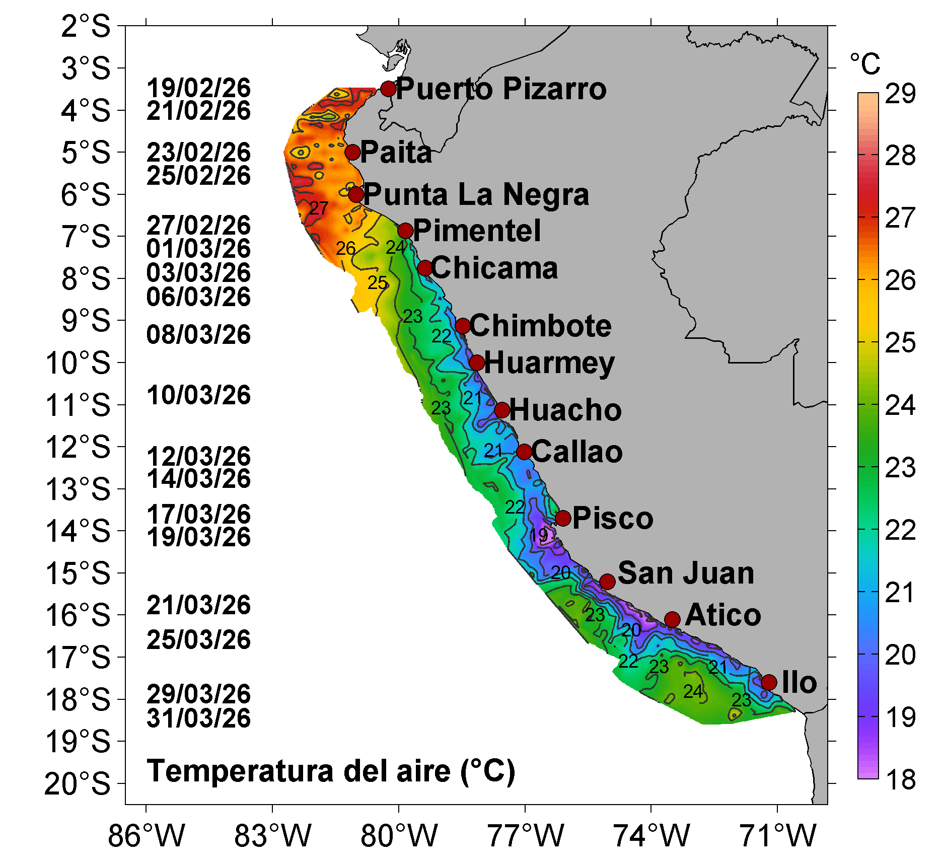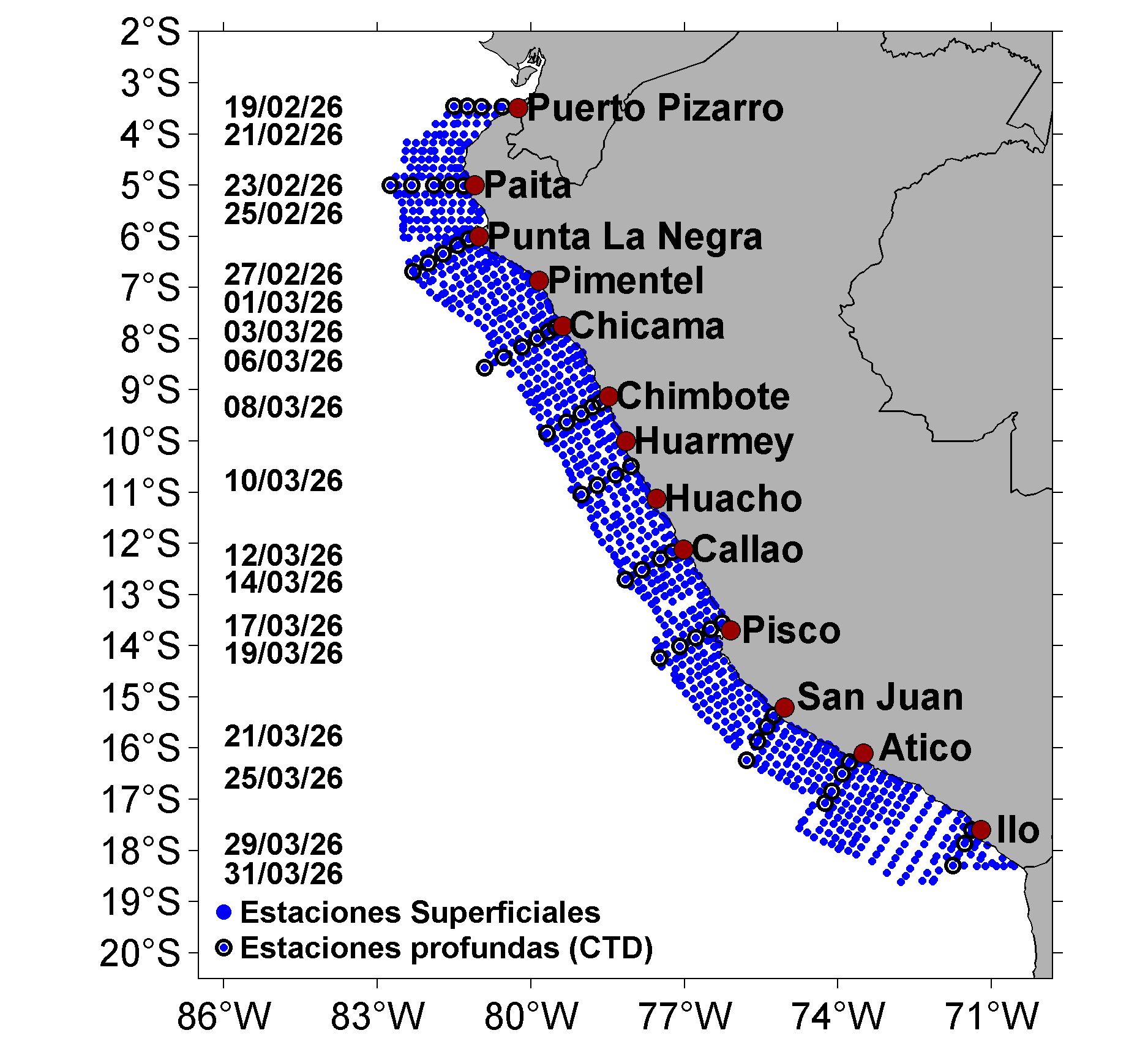 | Distribución superficial de las: estaciones superficiales y profundas, temperatura del aire (°C), presión atmosférica (mbar) y humedad relativa (%); registradas entre Puerto Pizarro y Morro Sama durante el Crucero de Evaluación Hidroacústica de la anchoveta entre el 19 de febrero y 31 de marzo, a bordo del BIC Humboldt y BIC Flores. Climatología: 1991-2020 (Domínguez et al (2023)). | |||