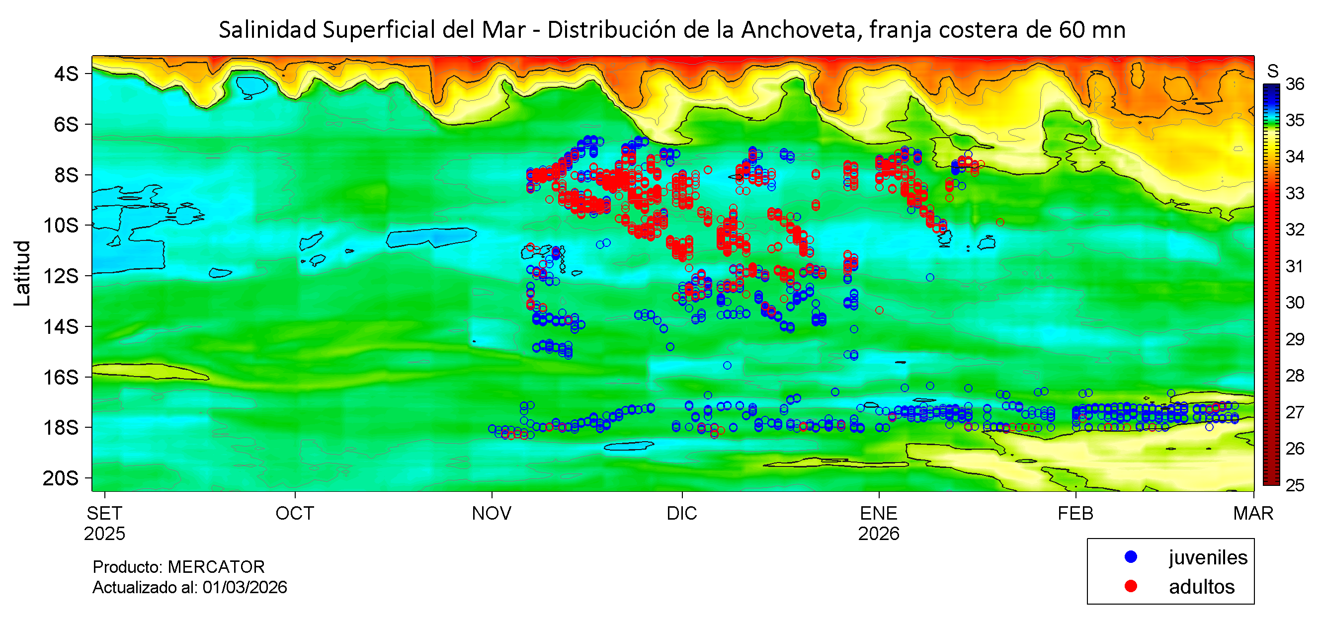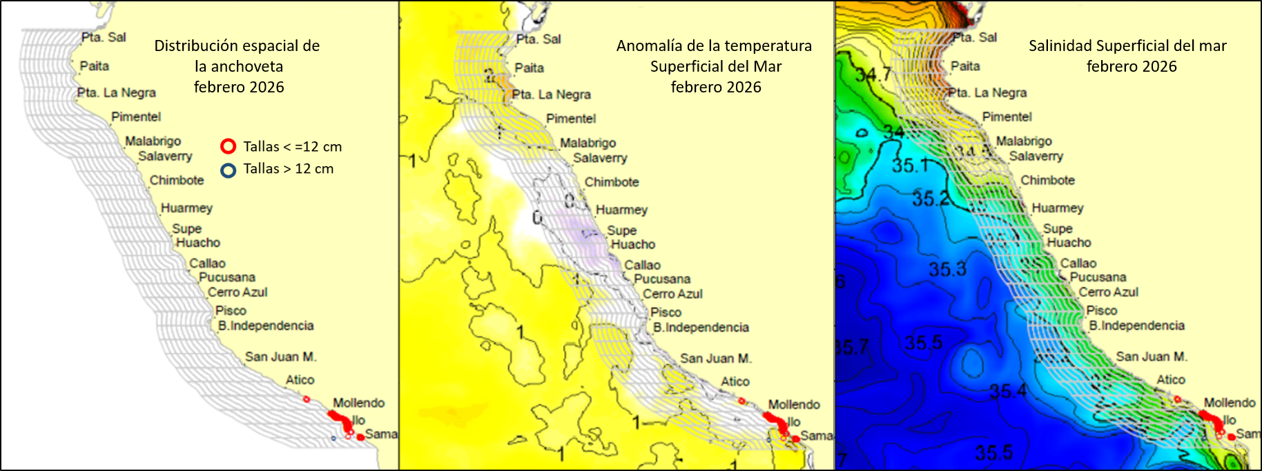 El análisis de la distribución espacio-temporal de la anchoveta se realiza considerando las condiciones oceanográficas de temperatura y salinidad superficial del mar, con una resolución diaria para la región Norte-Centro y Sur del litoral peruano, en función de las temporadas de pesca.