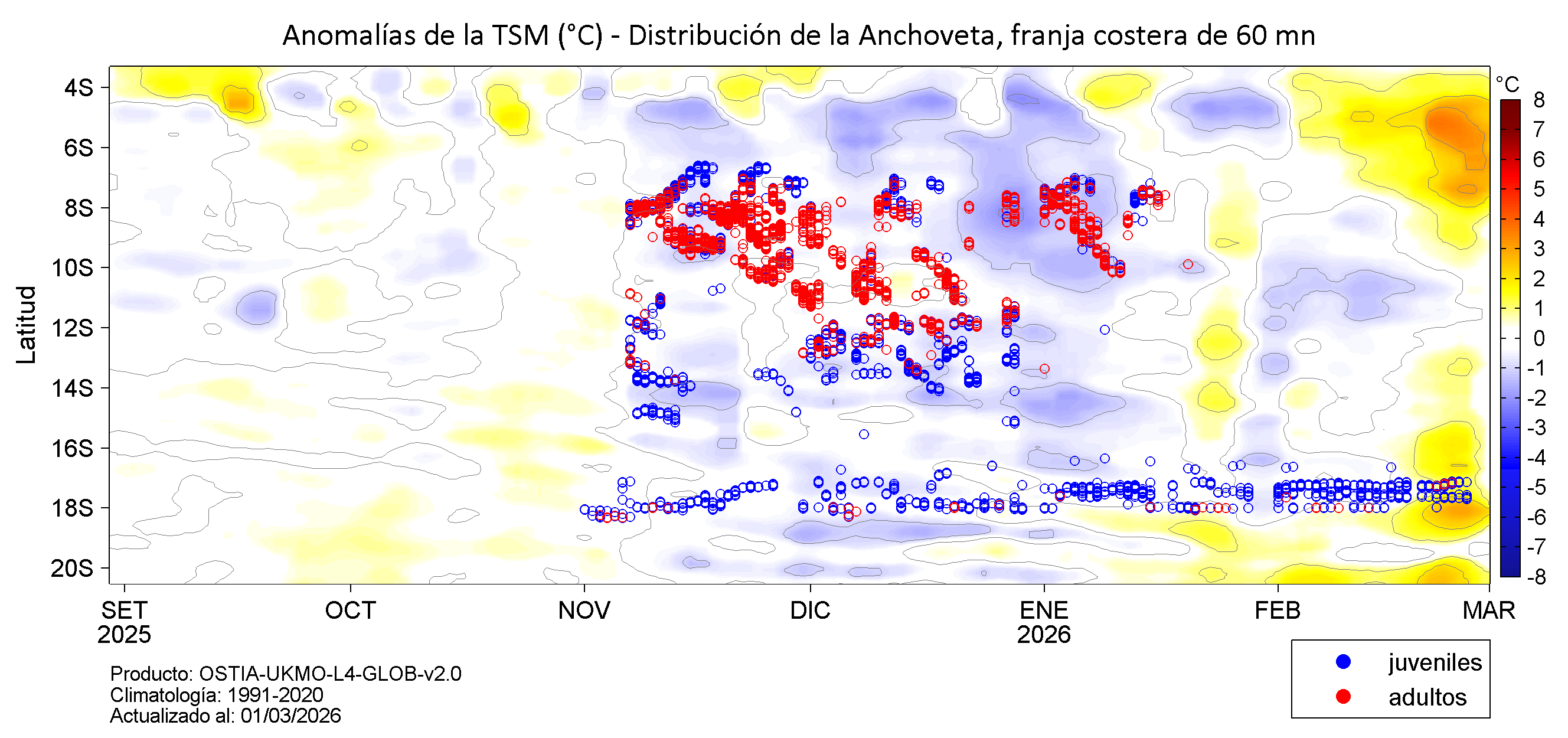 Series temporales de la evolución promedio latitudinal diaria de las anomalías de la temperatura y salinidad superficial del mar y la presencia de ejemplares de anchoveta (puntos) correspondientes a modas para ejemplares adultos con tamaños superiores a 12.0 cm de longitud total (LT) y juveniles con tallas menores o iguales a 12.0 cm LT.
