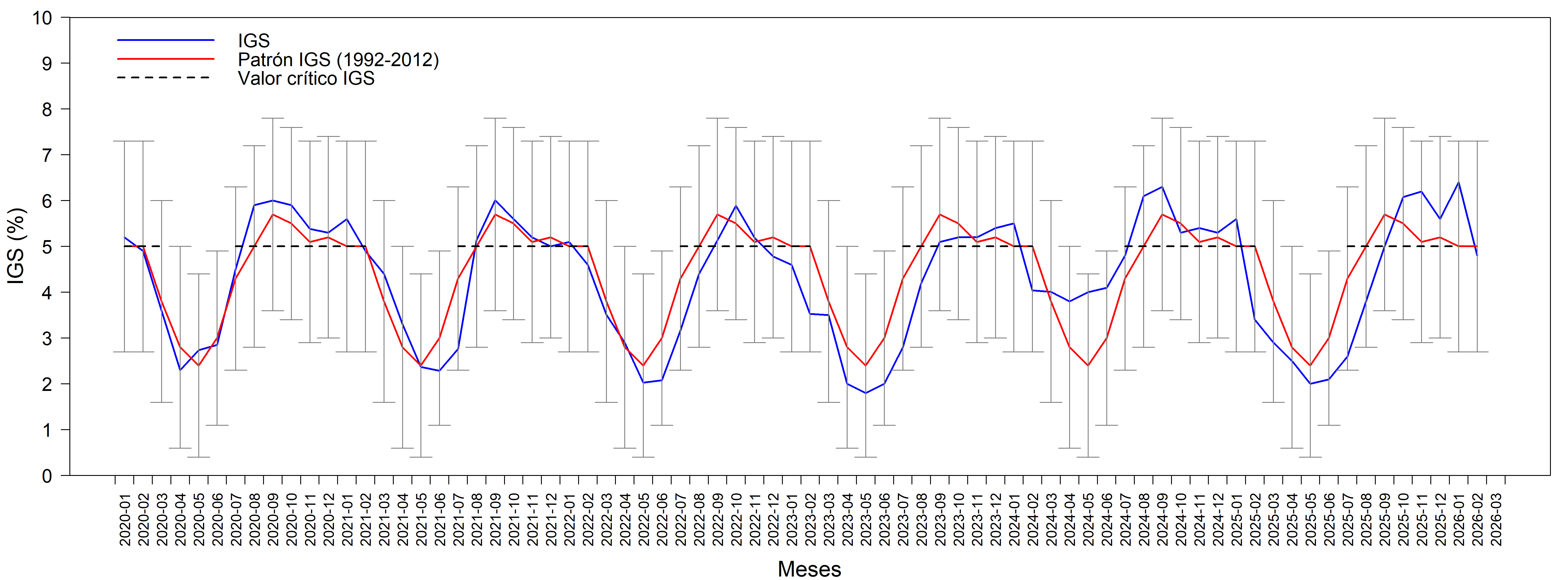 También llamado coeficiente de madurez. Es el peso de la gónada expresado como porcentaje del peso corporal o eviscerado (Saborido y Junquera 2003). Este índice puede ser utilizado indistintamente para hembras o para machos. En el caso de anchoveta peruana, se muestra el IGS de hembras adultas (Fig. 1). Se estima de acuerdo a la fórmula de Vazzoler (1982):