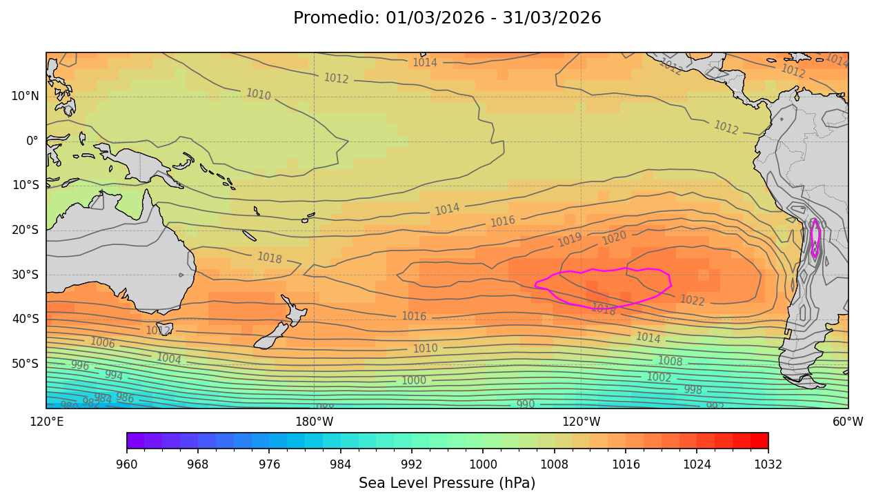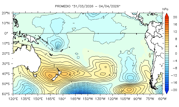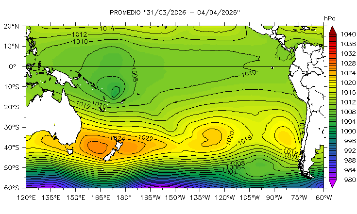 La presión atmosférica es obtenida de la base de datos del National Centers for Environmental Prediction/National Oceanic and Atmospheric Administration (NCEP/NOAA) (Kalnay et al., 1996) que registra variables meteorológicas en varios niveles de presión desde la superficie hasta los 10 hPa. Estos datos tienen una resolución espacial de 2,5° y se encuentran disponibles a una frecuencia diaria mediante el enlace http://www.esrl.noaa.gov/psd/ Con el fin de monitorear las zonas de alta y baja presión en el océano Pacífico tropical y subtropical, se muestra el mapa promedio de 5 días para la región comprendida entre 10° N a 60° S y de 120° E a 60° W, donde se observa la localización del Anticiclón del Pacífico Sur (APS). Asimismo, se presenta información de índices climáticos como el Índice del Anticiclón del Pacífico Sur (IAPS; Chamorro-Gómez., 2018 y Quispe-Ccalluari et al., 2015) así como el Índice de Oscilación del Sur (IOS; Ropelewski y Jones., 1987).