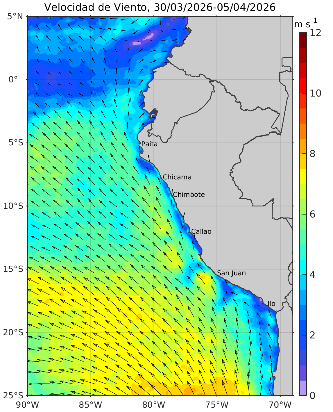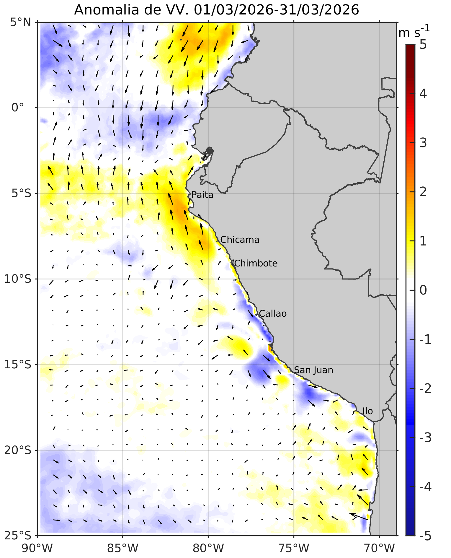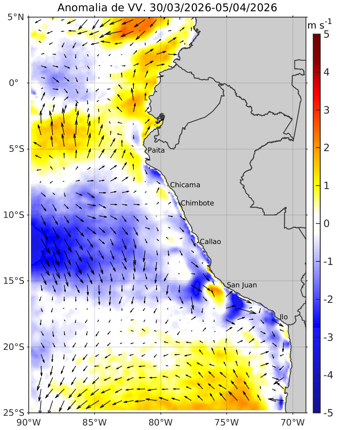 Promedio pentadal de velocidad del viento (m s-1) a la izquierda y anomalía de velocidad de viento (m s-1) a la derecha. El módulo del viento y su anomalía se representa en colores y la velocidad del viento y su anomalía se representa con vectores. Fuente de datos: CMEMS (Copernicus Marine Service, https://marine.copernicus.eu/es). Climatología 2000-2020. Procesamiento: DGIOCC/IMARPE.