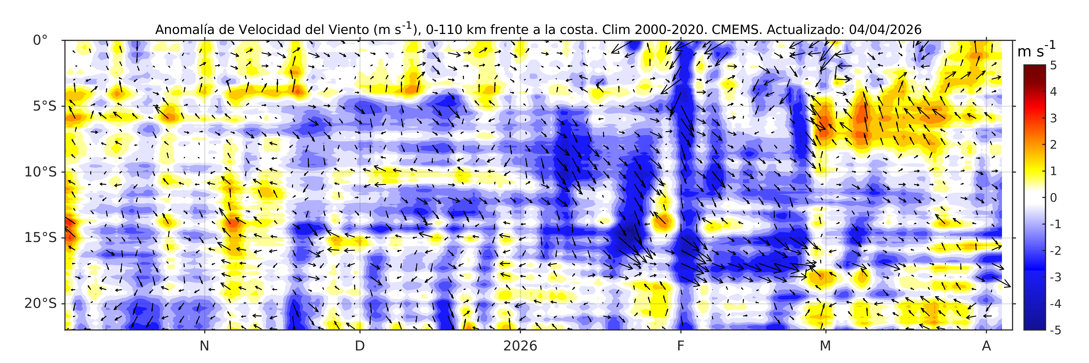 Diagrama Hovmöller de módulo y velocidad del viento (arriba) y su anomalía (abajo) en m s-1 promedio en la banda de 110 km adyacente a la costa peruana durante los últimos seis meses. El módulo del viento y su anomalía se representa en colores y la velocidad del viento y su anomalía se representa con vectores. CMEMS (Copernicus Marine Service, https://marine.copernicus.eu/es). Climatología 2000-2020. . Procesamiento: DGIOCC/IMARPE.
