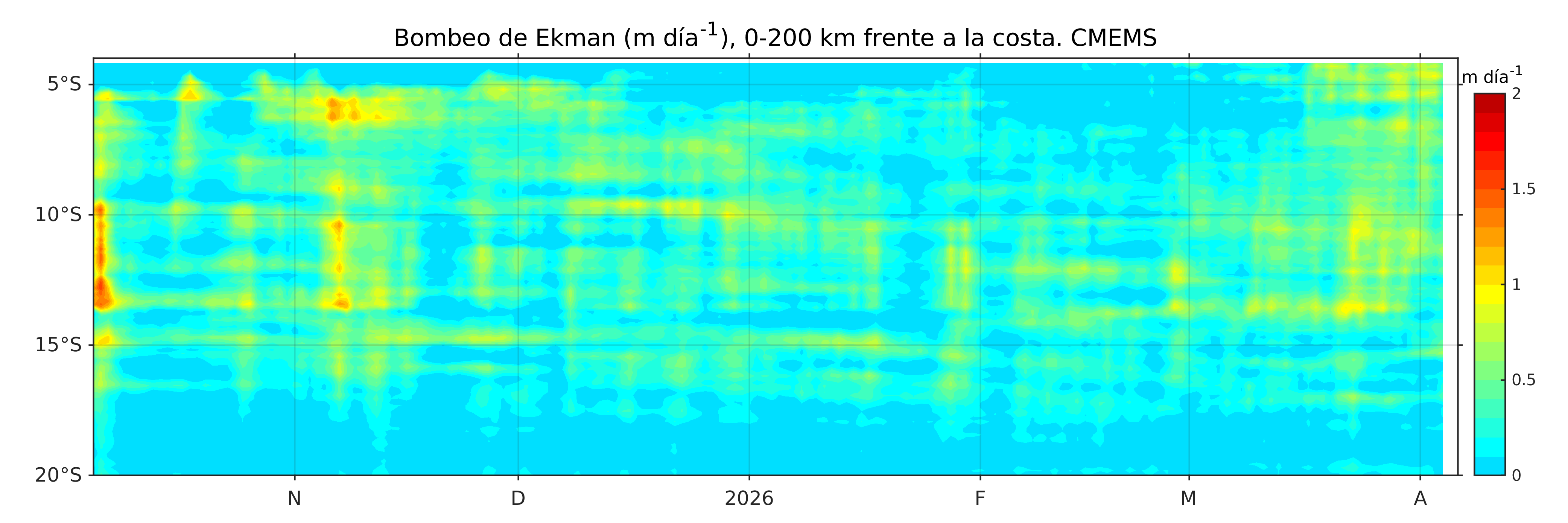 A partir de la información de vientos se calculó una climatología entre 2000 y 2020, para el posterior cálculo de las anomalías de velocidad de viento. Además, se calculó el Transporte y Bombeo de Ekman en base a la velocidad de viento, como índices para monitorear el afloramiento en el mar peruano (Anculle et al 2025, en preparación).